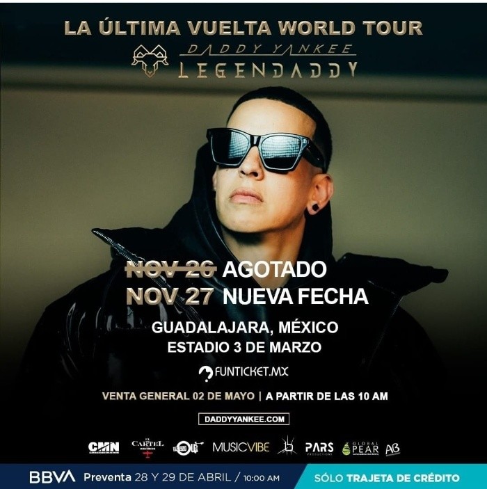 ¿Te quedaste sin boletos para ver al astro boricua Daddy Yankee? No te preocupes, debido al éxito de ventas para verlo en concierto el próximo 26 de noviembre en el Estadio 3 de Marzo, se ha abierto una nueva fecha, ésta será un día después, el día 27 en el mismo recinto.Los boletos estarán a la venta a partir del 2 de mayo para el público en general, mientras que la preventa especial para clientes de BBVA será los días 28 y 29 de abril a través de Funticket.mx.El reggaetonero presentará "La Última Vuelta World Tour" donde interpretará los temas de su reciente disco "Legendaddy". En esta placa tiene importantes colaboraciones con personalidades como Bad Bunny, Natti Natasha, Rauw Alejandro, Becky G y Pítbull, entre otros.El intérprete de "Gasolina", es uno de los máximos exponentes de la música urbana, género que ha definido a las nuevas generaciones y que se ha posicionado como el estilo musical más importante de las listas de popularidad.JL