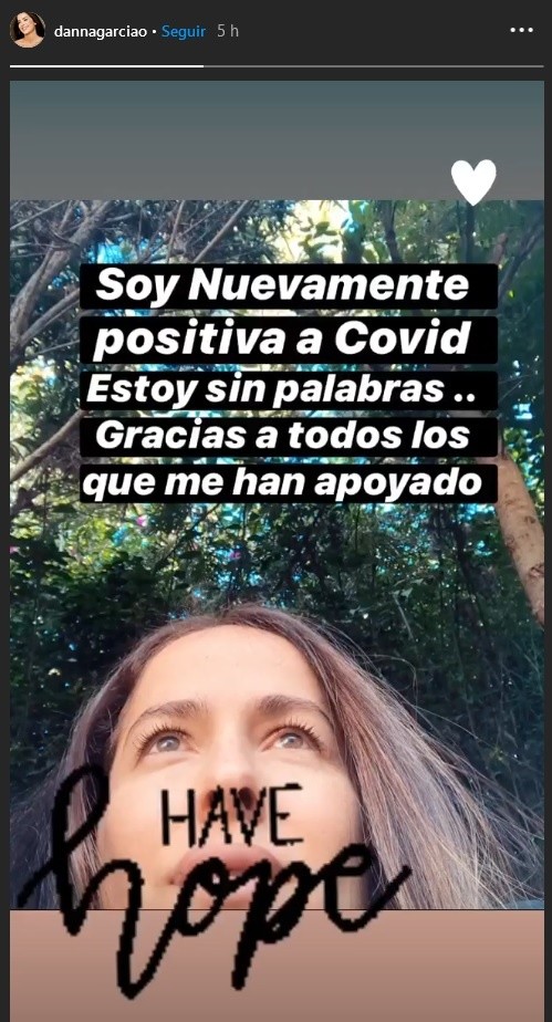 Danna García, actriz de la telenovela "Pasión de gavilanes", sorprendió a sus miles de seguidores al confirmar que dio positivo a la prueba de coronavirus Covid-19 por tercera ocasiónLa intérprete colombiana se refirió a su actual estado de salud en un reciente Instagram Storie, donde expresó gratitud por las personas que se han preocupado por ella."Soy nuevamente positivo a Covid. Estoy sin palabras. Gracias a todos los que me han apoyado", fue el conciso mensaje de la actriz de 42 años.En entrevista con El Universal, la colombiana aseguró que quiere ser donadora de plasma para que la gente pueda salvarse del COVID-19."Me dicen que hay un lugar a donde podría acercarme pero todo esto del plasma todavía es algo que no está muy regularizado o no se está haciendo mucho, se hace más en otros países que en México porque se considera un tratamiento experimental."Yo soy la primera que está en la fila para ayudar y, además, sé que mi tipo de sangre no es tan común entonces imagínate si puedo ayudar, yo soy A- y tengo entendido que no es común", añade.jb