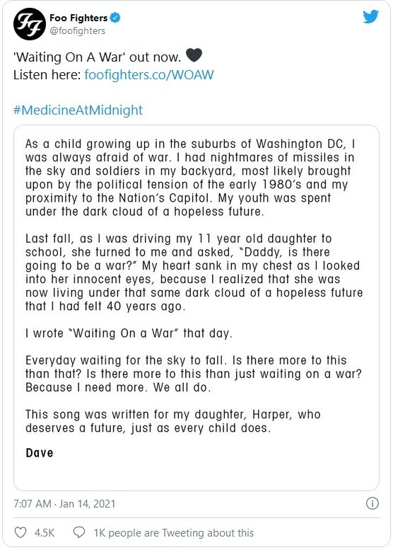 Con el deseo de que todos los niños puedan vivir en un mundo mejor, Dave Grohl, líder de la banda de rock Foo Fighters, celebra su cumpleaños con una nueva canción que dedica a su hija."El otoño pasado, mientras conducía a mi hija a la escuela, se volvió hacia mí y me preguntó: 'Papá, ¿habrá una guerra?'. Mi corazón se hundió cuando me di cuenta de que ella ahora estaba viviendo bajo la misma nube oscura que yo había sentido hace 40 años", comentó el cantante mediante una publicación en las redes oficiales de la banda.La canción que compuso el músico ese día decidió llamarla "Waiting on a War", y esperó a su cumpleaños número 52 para compartirla con todos sus admiradores."Escribí 'Waiting On A War' ese mismo día. Cada día esperando a que se desmorone el cielo. ¿Hay algo más que eso? ¿Hay algo más que sólo estar esperando una guerra? Porque yo necesito más. Todos lo necesitamos. Está canción fue escrita para mi hija Harper quien merece un futuro, como todos los demás niños", explicóEl tema ya se encuentra disponible en todas las plataformas digitales, y hasta el momento ya ha conseguido más de 100 mil reproducciones en la plataforma de YouTube.El tema formará parte del nuevo disco de la banda "Medicine at Midnight", que saldrá a la venta el próximo 5 de febrero.JM