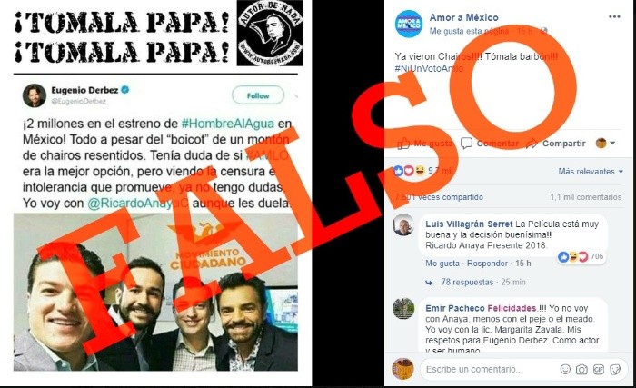 El actor y comediante Eugenio Derbez habría enviado un tuit para celebrar que dos millones de personas asistieron al estreno de su nueva película, Hombre al agua, “a pesar del ‘boicot’ de un montón de chairos resentidos” y para anunciar que apoyaría al candidato presidencial Ricardo Anaya. Pero el tuit es falso.Esta publicación falsa ya tiene más de 21 mil interacciones en redes sociales, más de las que ha obtenido un tuit real, enviado el 11 de mayo por el actor, en el que el actor agradeció el éxito de su película sin hacer ninguna referencia política ni electoral.Este tuit verdadero lleva 17 mil interacciones.En el caso del tuit falso, Derbez aparece con los candidatos de la coalición Por México al Frente, Samuel García, Luis Donaldo Colosio y Agustín Basave, y tiene el logo del Movimiento Ciudadano a sus espaldas.El mensaje completo fue publicado en la página de Facebook Amor a México, y dice así: “¡2 millones en el estreno de #HombreAlAgua en México! Todo a pesar del "boicot" de un montón de chairos resentidos. Tenía duda de si #AMLO era la mejor opción, pero viendo la censura e intolerancia que promueve, ya no tengo dudas. Yo voy con @RicardoAnayaC aunque les duela”.En realidad, la imagen fue tomada en las instalaciones de Radio Fórmula, días antes, como se puede apreciar en la imagen original, como también pudo confirmar Luis Roberto Castrillón, periodista de El editor de la Semana.El tuit original de Derbez contiene una imagen en la que aparece el actor con cara de sorpresa y el mensaje: “Mi cara cuando supe que le ganamos a Avengers”.La publicación falsa profundiza la polémica generada la última semana, después de que Derbez dijera en una entrevista con Ciro Gómez Leyva que no había decidido por quién votar y que no estaba seguro de que el candidato Andrés Manuel López Obrador fuera la mejor opción. “Yo estoy con dudas porque no estoy seguro que López Obrador pueda ser la mejor opción y, en general, la gente está votando por el menos peor y no creo que eso sea bueno para el país”, señaló en esa ocasión.Varios usuarios en redes respondieron a la declaración del comediante con un llamado al boicot a la película de Derbez con el mensaje “no creo que ver su película sea la mejor opción”.El actor respondió al llamado de los usuarios en una entrevista posterior con Joaquín López Dóriga, en la que aclaró que lo único que había dicho es que aún no decidía su voto y lamentó las reacciones que eso había generado. “Yo nada más comenté que no estoy seguro por quién votar; como creo, la mayoría de los mexicanos tenemos dudas. Yo sólo dije que no estaba seguro y eso habla de la intolerancia que estamos teniendo como país (...) Que mal que como país seamos tan intolerantes y en lugar de estar unidos para encontrar cual es el mejor candidato, estemos tan desunidos”, añadió.