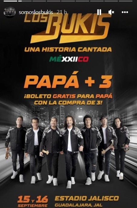 Para iniciar con las celebraciones del Día del Padre, Los Bukis están regalando boletos para que los reyes del hogar puedan disfrutar de sus conciertos en Guadalajara, Monterrey, Ciudad de México y Tijuana en septiembre, según informó la agrupación liderada por Marco Antonio Solís.De acuerdo con la publicación de Los Bukis, se obsequiará un pase extra para aquellos que compren tres de los boletos para los conciertos antes mencionados, del 13 al 19 de junio.“Amigos (...) quedan pocos días para que esta promo termine y queremos que la aprovechen al máximo”, escribió la banda conocida por éxitos como “Mi mayor necesidad”. “Consideren a papá como se merece. Nos vemos el 10 de septiembre”.La preventa para los boletos de Los Bukis dio inicio el pasado 24 de febrero, y a partir del 28 se abrió para el público general. Los precios para el concierto en el Estadio Jalisco van desde los 590 pesos hasta los 7 mil 990 pesos.Los Bukis confirmaron las cinco fechas que tendrán en el país como parte de su gira “Una historia cantada” que, de momento, contempla iniciar en Tijuana el 3 de septiembre (Estadio Caliente), el 10 de septiembre en Monterrey (Estadio Sultanes), el 15 de septiembre en Guadalajara (Estadio Jalisco), el 5 de noviembre en Morelia (Estadio V. Carranza) y finalizando en el Estadio Azteca, en Ciudad de México, el 3 de diciembre.Marco Antonio Solís señaló que la pandemia fue un detonante para lograr que el reencuentro de Los Bukis se concretara, pues evidentemente hubo un impacto social y emocional ante las pérdidas que cada familia ha tenido a raíz de la pandemia y diversas situaciones, por lo que se analizó la posibilidad de reunirse, aprovechar el tiempo para estar más unidos y así recordar épocas en las que Los Bukis fueron clave en momentos familiares de sus fans.AC