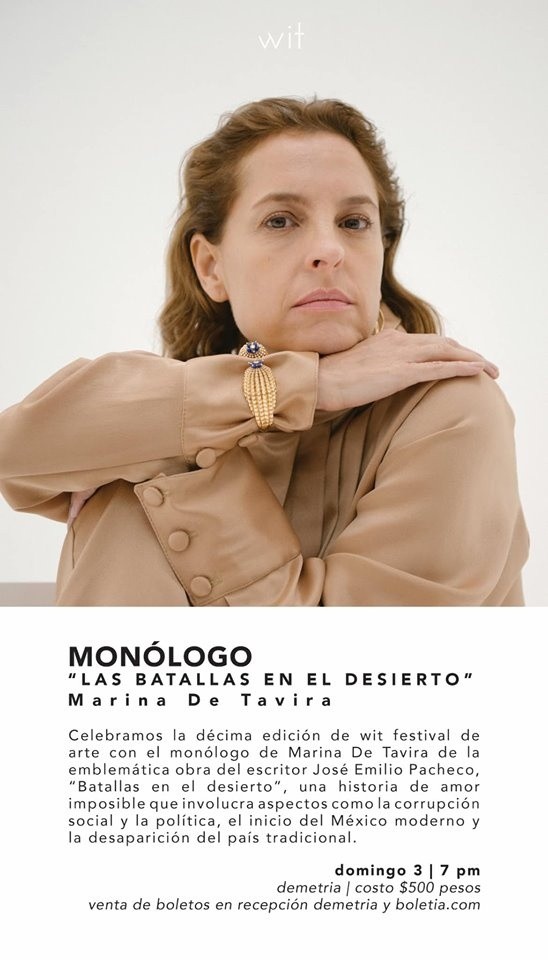 Leer es una constante en Marina de Tavira. De las letras han surgido los personajes que marcan su trayectoria actoral, por lo que rendir homenaje a la lectura con una de sus historias favoritas será su labor en la décima edición del WIT Festival de Arte.Sin escenografías ni caracterizaciones de por medio, Marina de Tavira regresará a Guadalajara para adentrarse en “Las batallas en el desierto” de José Emilio Pacheco, haciendo uso solamente de su voz, con la que revivirá el inocente amor que “Carlos” le profesa a “Mariana”.En entrevista, la actriz detalla respecto a esta actividad: “Soy alguien que cree profundamente en la literatura, si nos acercamos a los libros seremos mejores personas. Creo que un mundo que lee podrá ser un mejor mundo. Me encantan que existan espacios que fomenten el acercamiento a la literatura”.La actriz, nominada al Oscar por “Roma” señala la fascinación que “Las batallas en el desierto” le ha provocado desde su primera lectura cuando era adolescente y las diversas perspectivas que ha sumado en reencuentros posteriores con esta obra que también ha sido adaptada al cine en “Mariana, Mariana”, de Alberto Isaac, y en la música por Café Tacvba en la canción “Las batallas”.“Es un libro que he leído varias veces, la primera vez yo era adolescente. Hace algunos años volví a este texto, cuando murió José Emilio Pacheco (2014); antes de filmar ‘Roma’ también lo volví a leer. Las últimas veces que estuve en Guadalajara fue con teatro con ‘La mujer justa’ y ‘El corazón de la materia’ y me encanta regresar a la ciudad en otra disciplina con la lectura de un texto, reunirnos alrededor de la lectura”.Tras ser galardonada con el Premio Cuervo en el Festival Internacional de Cine de Morelia, Marina decidió donar el incentivo económico que recibió (120 mil pesos) para impulsar la postproducción del documental enfocado en retratar la vida de las mujeres embarazadas que reciben apoyo para su parto en su tránsito de migración en la frontera de México y Guatemala.“Me sentí como un puente o un canal para que ese dinero llegara a algún proyecto de cine que me resultara y dijera algo importante. Este documental, que producen Fernando Eimbcke y Alex Noppel, es sobre una mujer embarazada que está cruzando la frontera de Guatemala y se encuentra a una mujer indígena mexicana partera que se dedica a trabajar con las mujeres que están en esta situación. Me es algo significativo porque es una situación muy vulnerable para las mujeres y los bebés, son gente sin tierra”.Marina destaca que no estará involucrada en el proyecto de manera interpretativa o de producción, sin embargo, considera que apoyar desde diversas trincheras a proyectos que abogan por exponer las diversas problemáticas que enfrentan las mujeres es una responsabilidad que desde el cine debe ser prioridad para unir esfuerzos contra la violencia de género.“El cine debe ser para ayudar. Ahora estamos en una situación espeluznante, debemos pararnos, no sé cómo el mundo sigue girando y no nos detenemos frente a lo que está sucediendo. En México se asesinan a nueve mujeres todos los días, es algo que debería detenernos a todos”.Tras el estreno de la serie animada “El cristal encantado: la era de la resistencia” de Netflix, en la que Marina de Tavira presta su voz al personaje “Maudra Fara”, la actriz puntualiza que de momento no existen nuevos proyectos pactados para la plataforma de streaming ni otros planes para regresar al doblaje, ya que está enfocada en su próxima producción en Nueva Orleans: “Reminiscence” de Warner Bros, en el que figuran actores como Hugh Jackman y Rebecca Ferguson.“‘El cristal encantado’ fue un acto de nostalgia, su película original me marcó en la infancia y tenía muchas ganas de compartir esto con mi hijo de una manera especial. Ahora no tengo otro proyecto para darle voz a una animación, pero cuando ocurre es algo que disfruto. A través de la voz se pueden hacer muchas cosas”.Lectura de “Las batallas en el desierto”, por Marina de Tavira en el WIT Festival de Arte, el 3 de noviembre a las 19:00 horas en el Hotel Demetria, ubicado en Avenida La Paz 2219 esquina con Avenida Américas. Boletos: 500 pesos. Más información en el Facebook del Hotel Demetria.