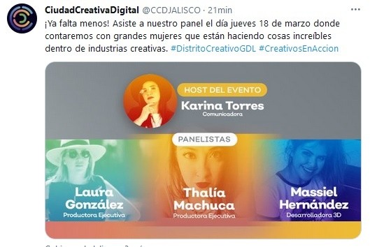 Como parte de las actividades virtuales de Ciudad Creativa Digital y de la iniciativa “Distrito Creativo presenta”, el próximo 18 de marzo se realizará la charla “Las mujeres en las industrias creativas”, que se transmitirá gratuitamente a las 10:00 horas a través del Facebook de Ciudad Creativa Digital.Para esta charla se contará con la presencia de Laura González, productora ejecutiva de Mango Films y Socia Fundadora de FFFRAME, la primera casa productora de ingeniería visual en Latinoamérica, así como de Thalía Machuca, productora de animación, reconocida por desarrollar contenido para la nueva plataforma de Disney Plus, y Massiel Hernández, artista digital con especialidad en crear modelos 3D en Amber México, estudio internacional de desarrollo de videojuegos fundado por un colectivo de creativos que residen en San Francisco, Los Ángeles y Bucarest.“Las Mujeres en la Industria Creativa” es un panel que busca transmitir las experiencias, el desarrollo y la enseñanza de las panelistas, para que más mujeres incursionen y triunfen en la industria creativa digital. Jalisco es líder en el constante crecimiento de la industria creativa a nivel nacional.De 2017 a 2018 se registraron un total de 203,610 profesionistas vinculados directamente con la industria del entretenimiento digital, de los cuales, el 29.4% es representado por el talento femenino en la industria a nivel nacional.Panel: “Las mujeres en la industria creativa”, el jueves 18 de marzo a las 10:00 horas a través del Facebook Live de Ciudad Creativa Digital. Más información en ciudadcreativadigital.mx e Instagram @ccdjalisco