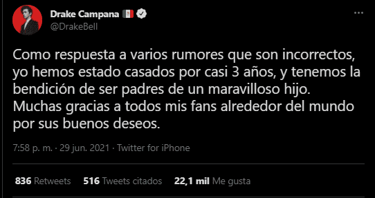 Drake Bell fue visto en Disneyland con Janet Von Shmeling y un pequeño bebé, quienes resultaron ser la esposa e hijo del cantante. Esto sucedió días después de que el también actor se declarara culpable de las acusaciones por poner en peligro a menores.De acuerdo con Dailymail, Drake celebró su cumpleaños 35 en Disneyland en California junto a su esposa —cuya relación mantiene oculta desde hace tres años—.“Hemos estado casados por casi 3 años, y tenemos la bendición de ser padres de un maravilloso hijo”, aclaró Drake Bell sobre los rumores que se crearon en redes. “Muchas gracias a todos mis fans alrededor del mundo por sus buenos deseos”.El pasado 23 de junio, Drake tuvo una audiencia por las acusaciones en su contra por intento de poner en peligro a menores y difundir asusntos dañinos para los menores, mismas que admitió ser culpable. Los hechos ocurrieron en 2017, pero fue hasta hace unas semanas que se le detuvo por estos cargos. De acuerdo con Fox 8 News, Bell habría participado en una conversación inapropiada con la víctima.AC