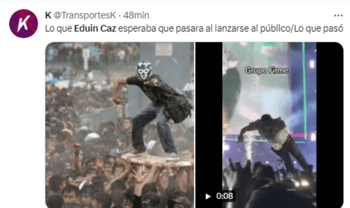 Una vez más Eduin Caz, vocalista de Grupo Firme, se ha convertido en tema de conversación en las redes sociales pues durante uno de sus conciertos decidió lanzarse al público como toda una estrella de rock, pero lamentablemente no esperaba que sus fans se hicieran a un lado y lo dejaran caer. Grupo Firme se presentó en el Sofi Stadium, en California, como parte del Festival Sueños 2023 de Chicago, donde el intérprete de "Ya supérame" vivió un momento vergonzoso. Varios de los asistentes grabaron el momento exacto de la acción y lo compartieron rápidamente en redes sociales volviéndose viral en muy pocas horas. Usuarios reaccionaron al video con burlas, incluso no perdieron el tiempo y compartieron varios memes sobre su caída en pleno espectáculo. MF