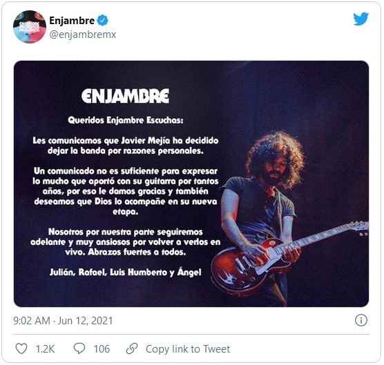Seguidores del rock mexicano se encuentran tristes y consternados, pues la banda Enjambre anunció a través de sus redes sociales la salida de su guitarrista Javier Mejía.Este sábado, mediante un comunicado, la agrupación originaria de Zacatecas informó que uno de sus integrantes más queridos decidió salirse por "motivos personales", sin dar más explicaciones. De forma inmediata, sus seguidores empezaron a reaccionar con comentarios de tristeza sobre su decisión."Les comunicamos que Javier Mejía ha decidido dejar la banda por motivos personales", se lee en el comunicado.La banda, que fue fundada en 2001 y ha tenido éxitos como "Dulce soledad", "Visita", "Manía Cardiaca" y "Vida en el espejo", también le dio las gracias a su compañero que por los años que los acompañó.Javier deja la banda a un mes de que el grupo ofrezca conciertos en Estados Unidos.Por otro lado, Julián, Rafael, Luis Humberto y Ángel, quienes quedan en la agrupación, señalaron que esta decisión no implica la separación de Enjambre, sino al contrario, siguen planeando nuevos proyectos."Nosotros por nuestra parte seguiremos adelante y muy ansiosos por volver a verlos en vivo, abrazos fuertes a todos", explican.JM