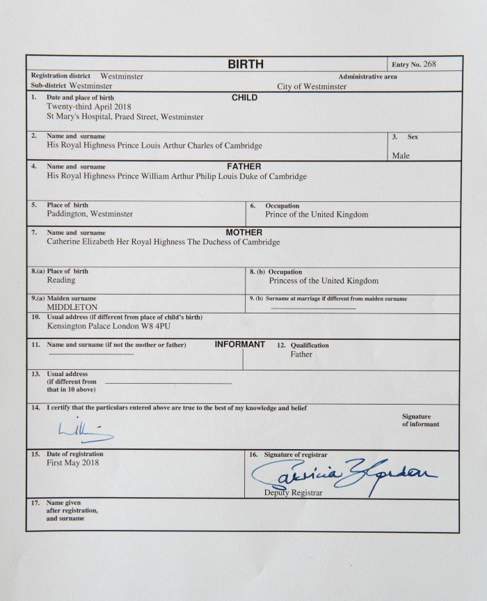 El príncipe Guillermo, duque de Cambridge, segundo en la línea de sucesión a la corona británica, firmó el certificado de nacimiento de su tercer hijo, el príncipe Luis, informa el Palacio de Kensington, su residencia oficial.En el documento se otorga al bebé el nombre de Luis Arturo Carlos, pero será conocido como Su Alteza Real el príncipe Luis de Cambridge.El certificado de nacimiento incluye la fecha -23 de abril de 2018- y el lugar -Hospital St Mary's de Londres- en los que nació el niño, así como el nombre completo de sus progenitores, el príncipe Guillermo y la duquesa Catalina de Cambridge.El príncipe Guillermo, hijo mayor del príncipe Carlos y la fallecida Diana de Gales, de 35 años, se ha tomado un permiso de paternidad para atender a su familia.Sus otros dos hijos son el príncipe Jorge, de 4 años, y la princesa Carlota, que mañana cumplirá 3 años.El tercer hijo de los duques de Cambridge es el sexto bisnieto de la reina Isabel II y ocupa el quinto puesto en la línea de sucesión al trono británico, por detrás de su abuelo, el príncipe Carlos, su padre y sus dos hermanos.EDML