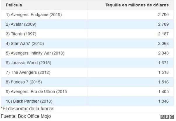 Los Avengers se volvieron a salir con la suya. Luego de vencer a Thanos dentro del universo Marvel, se anotaron una nueva victoria en el mundo real.Este domingo "Avengers: Endgame" se coronó como la película más taquillera de la historia, un título que durante 10 años había ostentado "Avatar", la fantasía épica de James Cameron.Así lo anuncio Kevin Feige, director ejecutivo de Marvel, en la conferencia de cómic Comic Con, que se celebró en San Diego, California, durante el fin de semana."Avengers: Endgame" ha recaudado US$2.790 millones hasta la fecha en todo el mundo, mientras que "Avatar" se quedó en poco más de US$2.789 millones.Avengers Endgame: ¿cómo funciona la física cuántica con la que Iron Man y su equipo intentan salvar el universo?El filme, que se estrenó en abril de 2019, recaudó US$854 millones en Estados Unidos, US$629 millones en China, US$105 millones en Corea del Sur y US$85 en Brasil.El éxito financiero de Avengers también estuvo acompañado de buenas críticas.Varias de las reseñas durante su estreno la calificaron de "gloriosa", "irresistible", "intensamente satisfactoria" y "obra maestra".En el sitio de reseñas Rotten Tomatoes tuvo una calificación por encima del 90%.El triunfo de Avengers, sin embargo, depende desde cómo se le mire.La cantidad que ha recaudado en taquilla no está ajustada a la inflación, es decir, la película ganó más dinero no por la cantidad de personas que la vieron, sino porque hoy los boletos de cine son más caros que en años anteriores.Sin ajuste de inflaciónEn un listado con la inflación ajustada, "Avatar "estaría por encima de Avengers, pero aun así habría otra película que las supera a ambas.Los historiadores del cine estiman que el clásico "Lo que el viento se llevó", de 1939, podría ser el filme más exitoso de la historia.Según el Libro Guinness de los Récords, "Lo que el viento se llevó" recaudó en su momento US$393,4 millones, que ajustados a la inflación equivalen a US$3.440 millones, es decir, cerca de US$650 millones más que "Avengers: Endgame".En 2009 Disney compró a Marvel, la productora de Avengers, y recientemente también adquirió a Fox, que tiene los derechos de "Avatar".Eso quiere decir que Mickey Mouse es el dueño de 7 de las 10 películas más taquilleras de todos los tiempos, si no se tiene en cuenta la inflación.Este listado incluye cuatro películas de la serie de Avengers.Durante el fin de semana en la conferencia Comic Con celebrada en San Diego, California, Marvel anunció 10 nuevas películas de superhéroes, de las cuales siete se estrenarán en 2021.***Ahora puedes recibir notificaciones de BBC Mundo. Descarga la nueva versión de nuestra app y actívalas para no perderte nuestro mejor contenido.¿Ya conoces nuestro canal de YouTube? ¡Suscríbete!