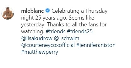 Hace 15 años terminó “Friends”, una de las series más aclamadas de los años 90, donde “Monica”, “Chandler”, "Joey", "Rachel", "Ross" y "Phoebe" dijeron adiós en 2004. Sin embargo, este jueves los actores protagonistas compartieron una fotografía en Instagram para celebrar el aniversario y agradecer a sus fans por el apoyo.La actriz, Courteney Cox (“Monica”) comenzó agradeciendo a sus “fieles seguidores” de todo el mundo por “estar allí para nosotros. ¡Amo a estos muchachos”, dijo, y etiquetó a sus ex compañeros de set Lisa Kudrow, Matt LeBlanc y David Schwimmer.También mencionó a Jennifer Aniston y Matthew Perry, pero a éstos como con los hashstag “#Seriouslyjen” y “#youtoomatthew”, dado que este par de actores no cuenta con la red social de Instagram. David Schwimmer, por su parte, aseguró que el proyecto de 10 temporadas no habría podido realizarse sin el apoyo de los fans.“Gran amor a los otros cinto ´friends´”, agregó.Lisa, quien interpretaba a la divertita “Pheobe Buffay”, conmovió a algunos con sus palabras en su respectiva fotografía.“Podríamos estar en diferentes lugares pero estamos conectados”, dijo la intérprete de “Smelly Cat” en la serie. Finalmente, Matt LeBlanc (“Joey Tribbiani”) dijo que “fue como si hubiera sido ayer” todas las aventuras de la serie, y agradeció a sus fans mor continuar viendo la serie pese a tanto tiempo desde su transmisión. Para celebrar estos 25 años aquí algunos datos curiosos y eventos especiales para los fans.Su famoso departamento se volverá real; desde este 19 de septiembre y hasta el 6 de octubre llega Warner House, experiencia en la que los seguidores podrán sentarse en algunos sets famosos, entre ellos el Central Perk y el departamento de "Friends".Desde filtros hasta curiosidades de la serie, trivias y "stickers" se podrán hacer con la aplicación Friends 25 que ya está disponible de manera gratuita en http://friends25app.comA partir del miércoles 18 de septiembre, a las 17.30 horas empieza el maratón con las diez temporadas de la serie. Se transmiten por Warner Channel y finalizará el domingo 22.Cameos. Muchas celebridades se sumaron a la ola que fue "Friends" y tuvieron pequeñas participaciones en la serie como Danny DeVito, que la hizo de stripper en la despedida de soltera de "Phoebe" regalándonos un momento tal vez no tan sensual pero sí muy divertido.Otros artistas que participaron fueron Julia Roberts, Bruce Willis, George Clooney y Brad Pitt.Nueva York... en California. Si bien la serie se desarrollaba en la mítica Nueva York en realidad se filmó casi en su totalidad en los estudios de Warner Bros en California.Antes de que el show saliera al aire el director Jimmy Burrows llevó a los protagonistas -Jennifer Aniston, Matthew Perry, Courteney Cox, Lisa Kudrow, Matt LeBlanc y David Schswimmer- a Las Vegas y les dijo: "Vayan al casino porque esta es la última vez que podrán ir a uno de manera anónima". ¡Y así fue!.Con información de SUNAC