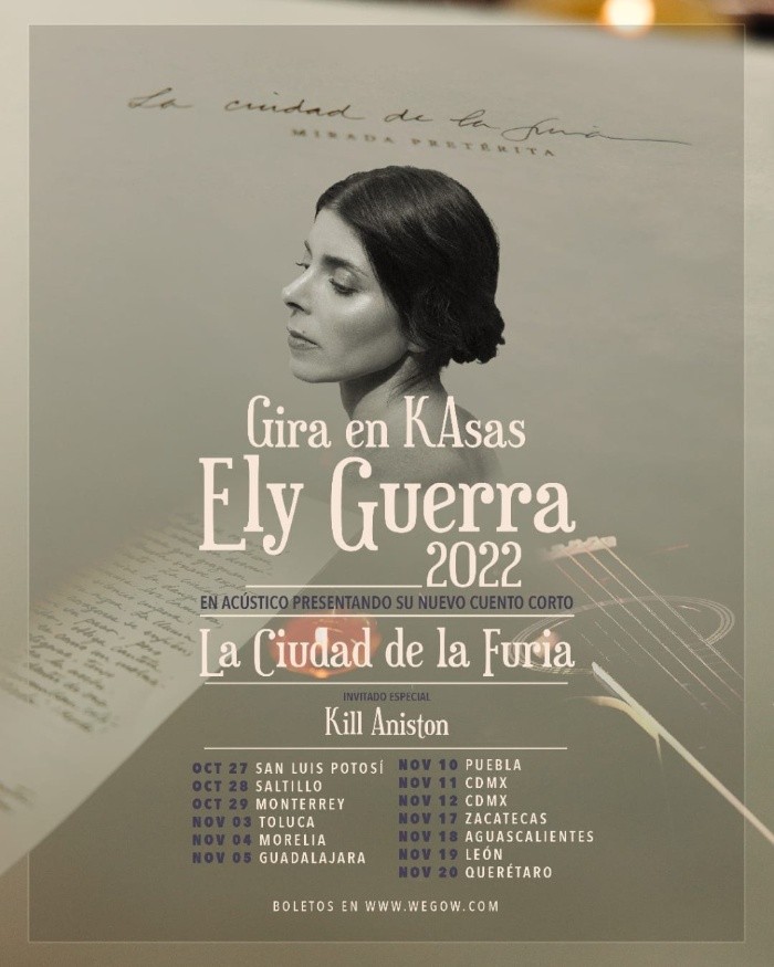 Celebrando 30 años de trayectoria, Ely Guerra alista su regreso a Guadalajara y será como parte de la gira KAsas 2022, organizada por el también músico mexicano Kill Aniston, quien será el abridor de esta serie de conciertos, los cuales se realizarán en casas particulares, por lo que tras registrarse y realizar la compra de boletos, los fanáticos recibirán –tres días antes- la confirmación con la ubicación del evento.En esta ocasión, la cantautora mexicana estará ofreciendo un concierto en formato acústico, donde dará lectura de su cuento corto “La Ciudad de la Furia” –de la colección “Mirada Pretérita”, 2007– el primero de la lista en haber sido enviado a imprenta, además, encuadernado de forma artesanal; un primer lanzamiento exclusivo para Gira en Kasas.En el caso de Guadalajara, Ely Guerra dará lectura a “La Ciudad de la Furia” y concierto acústico el 5 de noviembre en un recinto secreto. A través de sus redes sociales, la cantante ha compartido las ligas oficiales para acceder a los boletos de su gira.Ely Guerra es una cantautora y música independiente desde su empresa Homey Company; ha sido acreedora a tres nominaciones y ganadora de un Grammy Latino (2010). Se ha presentado con su música en todo el mundo, y entre sus diversas participaciones y proyectos resalta, por ejemplo, haber sido la interprete oficial del himno nacional mexicano durante la clausura de los Juegos Panamericanos del 2011.El primer DVD en su carrera, Ciclos (2013), filmado y grabado en vivo durante el concierto de cierre de gira Hombre invisible (INVIERNO 2011) en el Teatro Metropólitan de la Ciudad de México, atestigua la conclusión de una importante etapa en su trayectoria artística. En este emblemático proyecto, Ely no sólo nos conduce por el particular trayecto sónico de sus canciones en rock, sino que comparte también la intimidad del último color que su voz ha dibujado: Ely Jazz (Invisible Man 2011).Posteriormente, Ely Volví renovada para celebrar de manera única sus veinte años de resistencia y provocación musical con una gala a piano y voz, El Origen (Invierno 2014), tour con el que festejó su música en todo México hasta 2019, siendo puente directo hacia su último y muy diferente material: Zion.*San Luis Potosí – 27 octubre *Saltillo – 28 octubre *Monterrey - 29 octubre *Toluca- 3 noviembre *Morelia – 4 noviembre *Guadalajara – 5 noviembre *Puebla – 10 noviembre *CDMX – 11 y 12 noviembre *Zacatecas – 17 noviembre *Aguascalientes - 18 noviembre *León – 19 noviembre *Querétaro – 20 noviembreFS