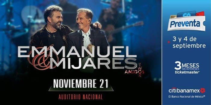 Los cantantes Emmanuel & Mijares llegarán por cuarta ocasión, en lo que va del año, al Auditorio Nacional con su espectáculo "Two'r Amigos", el cual han presentado por toda la República Mexicana y gran parte de Estados Unidos.El dueto, que se ha convertido en una de las parejas con mayor éxito, subirá al Coloso de Reforma el próximo 21 de noviembre. Los boletos estarán disponibles a partir del cinco de septiembre.Hace unos meses, los intérpretes fueron reconocidos por 50 conciertos ininterrumpidos en dicho escenario, con lo que el "Two’r Amigos" se convirtió, además, en uno de los espectáculos más aclamados.Lo que comenzó como una reunión para recordar canciones de los 80 y 90 parece no tener fin y, gracias a los nuevos arreglos de sus más grandes éxitos, han logrado conquistar a los jóvenes. AC