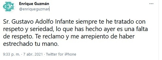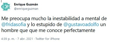 Después de que se diera a conocer la entrevista de Frida Sofía en donde acusa a su abuelo Enrique Guzmán de abuso desde que tenía cinco años, el cantante reaccionó.A través de sus redes sociales el intérprete de "Tu voz" compartió un tuit en donde cuestiona la salud mental de su nieta."Me preocupa mucho la inestabilidad a mental de @fridasofia y lo estupido de @gustavoadolfo, un hombre que que me conoce perfectamente", se lee.Horas después, el cantante compartió una serie de tuits dirigidos al periodista de espectáculos Gustavo Adolfo Infante:"Sr. Gustavo Adolfo Infante siempre te he tratado con respeto y seriedad, lo que has hecho ayer es una falta de respeto. Te reclamo y me arrepiento de haber estrechado tu mano", escribió.