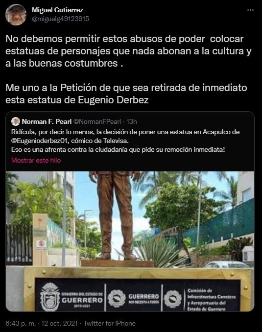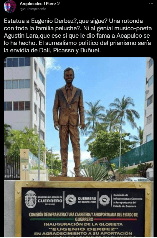 Eugenio Derbez no se salvó de las críticas y memes en redes sociales luego de estrenar su estatua en Acapulco, Guerrero el fin de semana pasado.Y es que la Comisión de Infraestructura Carretera y Aeroportuaria del Estado de Guerrero tuvo el buen gesto de celebrar este homenaje a Derbez y colocar la efigie frente al hotel Elcano “en agradecimiento a su aportación a la difusión de Acapulco en el Mundo”, según se lee en la placa. No obstante, los residentes no la aceptaron.Incluso la estatua de Derbez ha sido víctima de vandalismo y, tras cientos de peticiones en redes sociales, la estatua fue retirada. Sin embargo, se desconoce si regresará a la rotonda o quedará exiliada permanentemente.“No debemos permitir estos abusos de poder. Colocar estatuas de personajes que nada abonan a la cultura y a las buenas costumbres. Me uno a la petición de que sea retirada de inmediato”, escribió un usuario en Twitter, donde el nombre de Eugenio Derbez se volvió tendencia.Alguien más agregó: “Estatua de Eugenio Derbez? Qué sigue? Una rotonda con toda la familia peluche?”.Hasta el momento, Eugenio Derbez no ha hecho algún comentario al respecto. Pero precisamente el actor estrenó la serie “Acapulco” en Apple TV+, cuya trama está basada en los sueños de Máximo Gallardo en el hotel Las Colinas.Hace unos días, también se reveló que el actor de “No se aceptan devoluciones” formará parte del elenco de “Aristóteles y Dante revelan los secretos del universo”, una novela juvenil con temática LGBT. Eva Longoria también se une al cast.Aitch Alberto debutará como directora en este proyecto donde Derbez también participa como productor.AC