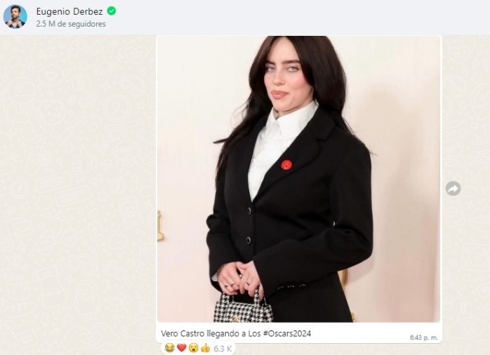 Eugenio Derbez lo vuelve a hacer, el actor desató una nueva polémica en las redes sociales cuando compartió en un grupo de Whatsapp una foto y un comentario en el que compara a la cantante y actriz estadounidense Billie Eilish con Verónica Castro."Vero Castro llegando a los Oscar 2024", escribió Derbez.Es que en dicha foto se ve a Billie luciendo una larga cabellera castaña oscura, lo que provoca que resalten mucho más sus ojos verdes azulados y sus pómulos, añadiendo a esto su traje elegante, que efectivamente hacen que tenga un gran parecido con la actriz mexicana Verónica Castro, quien le lleva 49 años de edad a la dos veces ganadora del Oscar."Billie Eilish se convirtió en Verónica Castro tan gradualmente que no nos dimos cuenta", "¿Por qué Billie Eilish parece Verónica Castro?", "Billie Eilish tiene 22 años y ya se parece a Verónica Castro", "Desde que dijeron que Billie Eilish se parece a Verónica Castro no la veo igual", fueron alguno de los comentarios que se dieron en X, confirmando lo que Derbez miró.Aunque hubo quienes reaccionaron inconformes ante la comparación, asegurando que era muy poco caballeroso de su parte haber hecho esto a modo de burla."Muy gracioso, no creo que le gustaría que lo compararan con alguien más", "Qué mal que compares a mujeres a manera de burla Derbez", se puede observar en alguna de las publicaciones.***Mantente al día con las noticias, únete a nuestro canal oficial de WhatsAppFA