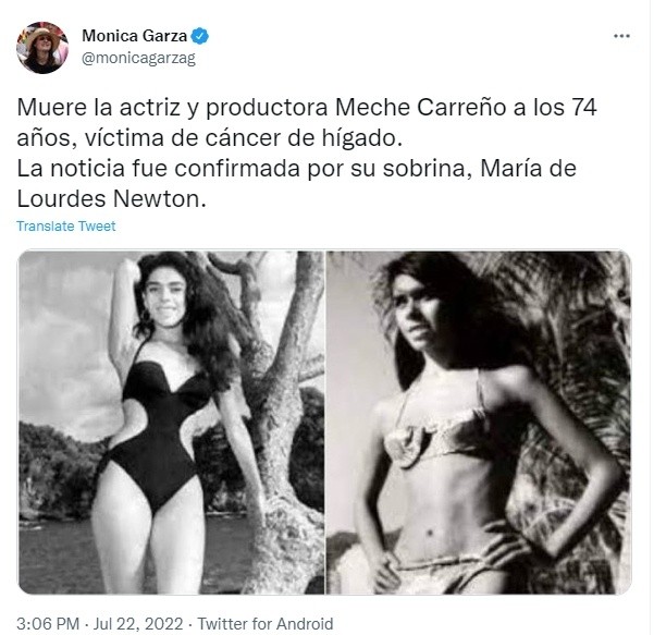 Mercedes Carreño, mejor conocida como Meche Carreño de 74 años, falleció hoy viernes en Estados Unidos debido a un cáncer de hígado, fue hospitalizada hace tres días, según reporta TV Azteca.Fue una actriz, productora y argumentista de cine, cuya época de mayor esplendor fue en la década de los 70. Es reconocida por su actuación en las películas "La Choca" y "La Otra Virginidad".Meche fue un ícono imperturbable del cine mexicano y una de las figuras más valientes de su época. "La Choca", "Damina y los hombres" y "La inocente", entre otras cintas, son algunas en las que participó no sólo como actriz, sino en algunos casos como guionista y productora.Ella se alejó de los escenarios tras perder a un hijo, se fue a Estados Unidos a dedicarse a su familia y a seguir estudiando dirección de cine.La periodista Mónica Garza y la actriz Laura Zapata, son algunas de las personas que han despedido a la actriz y productora a través de redes sociales. MA