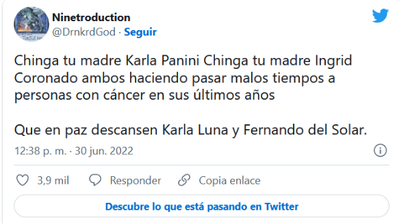 Luego de las múltiples críticas que ha recibido en redes sociales, la conductora Ingrid Coronado rompió el silencio a un día de que muriera su ex esposo y padre de dos hijos, Fernando del Solar.Fue a través de su cuenta de Instagram, que Ingrid Coronado compartió un comunicado en el que agradeció las muestras de cariño de familiares y amigos, pero también pidió respeto a la prensa, pues es un "momento en el que la paz y la unión familiar son lo más importante"."A nombre de Ingrid Coronado e hijos, agradecemos el apoyo, las muestras de cariño y solidaridad recibidas. A nuestros compañeros de prensa, de trabajo y amigos, les pedimos su comprensión y respeto en este momento", fue parte del comunicado que compartió a través de historias en Instagram.La ex conductora de TV Azteca, quien estuvo casada con Fernando del Solar del 2012 al 2015, ha sido fuertemente criticada por usuarios de redes sociales, quienes recordaron que la separación de ambos ocurrió mientras el estaba enfermo de cáncer.Incluso, la han comparado con Karla Panini, al considerarlas como las "artistas más odiadas" de México.Cabe recordar que Ingrid Coronado y Fernando del Solar tienen dos hijos, Luciano y Paolo, de 14 y 11 años, respectivamente.gc