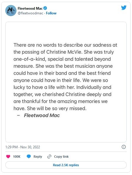 Christine McVie, la vocalista, compositora y tecladista británica de Fleetwood Mac cuya conmovedora voz de contralto ayudó a definir clásicos como "You Make Loving Fun", "Everywhere" y "Don't Stop", falleció el miércoles a los 79 años.Su muerte fue anunciada en las redes sociales de la agrupación. No se reveló la causa del deceso u otros detalles, pero un comunicado de su familia señalaba que había "fallecido pacíficamente en un hospital esta mañana" acompañada de sus seres queridos tras una "breve enfermedad"."Era realmente única, especial e inconmensurablemente talentosa", dijo la banda en un comunicado en el que definieron a McVie como "la mejor música que cualquiera podría haber tenido en su banda y la mejor amiga que cualquiera pudo tener en su vida".McVie fue una presencia y personalidad constante en la agrupación, famosa por sus frecuentes cambios de alineación y personalidades volátiles entre cuyos integrantes también destacan Stevie Nicks y Lindsey Buckingham.Durante sus años de mayor popularidad, de 1975-80, la banda vendió decenas de millones de álbumes y era una fuente de fascinación para los fans al transformar sus batallas personales en canciones melódicas y pegajosas.La misma McVie estuvo casada con el bajista John McVie, y su ruptura — junto con la separación de Nicks y Buckingham — fue célebremente documentada en su álbum "Rumours" de 1977, uno de los más populares de todos los tiempos.Fleetwood Mac, cofundada por el baterista Mick Fleetwood en 1967, fue incorporada al salón de la Fama del Rock and Roll en 1998. Entre los múltiples éxitos del grupo destacan "Dreams", "Go Your Own Way" y "Little Lies".JM