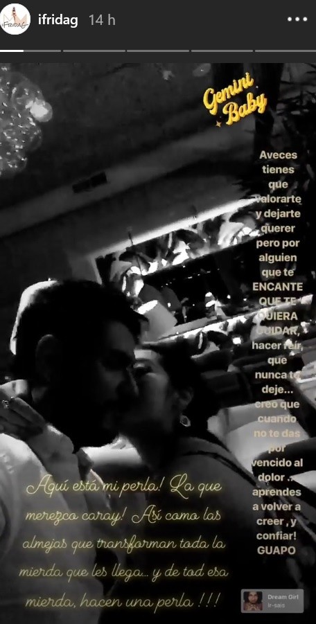 Frida Sofía está dejando atrás a su ex Christian Estrada para iniciar un nuevo capítulo en su vida y es que la hija de Alejandra Guzmán compartió a través de su cuenta de Instagram una imagen donde se ve que es consentida por un hombre a quien llama "su perla"."Aquí está mi perla. La que merezco, caray. Así como las almejas que transforman toda la mierda que les llega y de toda esa mierda hacen una perla", escribió la influencer a través de las historias de la red social de la camarita.En el video donde aparecen los dos jóvenes aparecen muy acaramelados la integrante de la dinastía Pinal agregó: "A veces tienes que valorarte y dejarte querer pero por alguien que te encante, que te quiera cuidar, hacer reír, que nunca te deje..."."Creo que cuando no te das por vencido al dolor... Aprendes a volver a creer y confiar. Guapo", finalizó.Hace unos días Frida Sofía rompió el silencio sobre la relación que su mamá, Alejandra Guzmán, mantiene con Christian Estrada, asegurando que no hablaría con él para arreglar la situación familiar, además de no entender por qué la intérprete de "Eternamente bella" cree que hay competencia entre ellas.LEE: Frida Sofía rompe el silencio y habla sobre su mamá y de su exnovio"Nunca me nacería ni siquiera juntarme a hablar, cuando es un ex es un ex. En realidad no entiendo, no entiendo qué hacía él ahí y en todas estas ocasiones como en el cumpleaños de mi má (mamá)... Pude haber ido porque estaba en Nueva York, pero ninguna llamada, en mi cumpleaños tampoco", comentó.JB