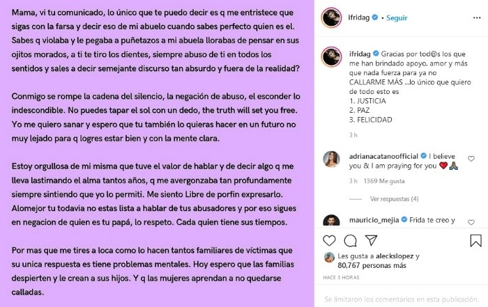 Frida Sofía contestó el comunicado que Alejandra Guzmán subió ayer sábado en sus redes sociales y en donde asegura meter las manos al fuego por su padre Enrique Guzmán, sin embargo, la nieta hoy aseguró estar triste por lo que publicó su famosa madre y dijo que el cantante de "Mi cabeza en tu hombro" no sólo la manoseó a ella sino que también golpeó y violó a Silvia Pinal en repetidas ocasiones.Al parecer el escándalo de la familia Guzmán-Pinal no tiene tregua y ahora la hija de la rockera usó nuevamente su cuenta de Instagram para expresar su sentir y de paso abrir más la herida al asegurar que la Reina de Corazones supo lo que le hacía su padre a su famosa madre."Mamá, vi tu comunicado, lo único que te puedo decir es que me entristece que sigas con la farsa y decir eso de mi abuelo cuando sabes perfectamente quien es él. Sabes que violaba y que le pegaba puñetazos a mi abuela (Silvia Pinal). Llorabas de pensar en sus ojitos morados", escribió Frida.También reveló que en una ocasión el pionero del rock and roll en México le tiró los dientes a Alejandra y que también ella sufrió abusos de él, es por eso que Frida le recalcó a su madre que con ella se rompe la cadena de silencio que hay en su familia."A ti te tiró los dientes, siempre abusó de ti en todos los sentidos y sales a decir semejante discurso tan absurdo y fuera de la realidad?. Conmigo se rompe la cadena de silencio, la negación de abuso, el esconder lo indescondible. No puedes tapar el sol con un dedo, the truth will set you free (la verdad nos hará libres). Yo me quiero sanar y espero que tú también lo quieras hacer en un futuro no muy lejano para que logres estar bien y con la mente clara", deseó.La también cantante, pero de urbano, aseguró en su escrito estar muy orgullosa del valor que tuvo para hablar sobre lo que le sucedió desde los 5 años de edad y que ahora se siente libre de haber podido expresar su sentir, ya que siempre pensó que ella era quien permitía al cantante hacer lo que le hizo."A lo mejor tú todavía no estás lista a hablar de tus abusadores y por eso sigues en negación de quien es tu papá, lo respeto. Cada quien tiene sus tiempos."Por más que me tires de a loca como lo hacen tantos familiares de víctimas que su única respuesta es 'tiene problemas mentales'. Hoy espero que las familias despierten y le crean a sus hijos. Y que las mujeres aprendan a no quedarse calladas", finalizó.Alejandra Guzmán usó sus redes sociales ayer para defender de su padre Enrique Guzmán y además pedirle a su hija Frida Sofía que se acerque a ella para buscar un terapeuta y arreglar de la mejor manera las cosas."Creo que es tiempo de que yo hable, como madre he hecho todo lo que he podido por ayudar a mi hija, para acercarme a ella sin necesidad de cámaras ni de los medios, es delicado, es muy triste ver a mi padre comprender por lo que está pasando, porque yo también estoy pasando por esas acusaciones sin bases, que no son justas", expresó la cantante.En un video que posteó en su cuenta de Instagram, La Guzmán le reitera su amor a Frida y le ofrece ayuda profesional."…y te ofrezco Frida arreglar esto de la mejor manera, buscar un buen terapeuta, alguien que nos pueda ayudar, yo sé que podemos, te ofrezco mi corazón y todo mi amor porque yo te parí".La cantante también comentó que no quiere dar ninguna declaración al respecto de las acusaciones de abuso sexual, que su hija hizo en contra de su padre Enrique Guzmán, algo que, la llamada "Reina de corazones" niega rotundamente.Alejandra reiteró lo que la familia informó ayer a través de un comunicado, que ningún miembro de la familia emitirá alguna declaración a los medios de comunicación, porque señala, es un asunto familiar."A todos los medios les pido que comprendan que esto es un asunto familiar, que es un asunto delicado y que pongo las manos en el fuego por mi padre, que me ha dado y me ha enseñado a trabajar y es un ejemplo para mí, es un gran hombre, gracias a todos y por favor Frida acércate", finalizó.En una entrevista televisiva transmitida el pasado jueves, Frida Sofía dijo que su abuelo Enrique Guzmán, abusó de ella cuando tenía cinco años, además detalló que le infligió tocamientos reiteradamente."Me manoseó ... desde los 5 (años)", afirmó Frida Sofía tratando de contener las lágrimas.La familia Guzmán Pinal desea que Frida Sofía consiga ayuda para mejorar su salud mental, así lo dieron a conocer en un comunicado en el que externan su postura sobre las declaraciones que recientemente dio la hija de Alejandra Guzmán en una entrevista, donde asegura que su abuelo Enrique Guzmán la toqueteó cuando tenía cinco años.En dicho comunicado, Alejandra Guzmán y la familia enfatiza que le han hecho saber a Frida que la aman y que están abiertos a aclarar las cosas y a que se dé una reconciliación, siempre y cuando esto se dé de manera privada."Hemos optado por no responder a través de los medios de comunicación, sino haciéndole saber a Frida que la amamos, que esperamos que consiga la ayuda para mejorar su salud mental que tan claramente requiere y que estamos aquí con los brazos abiertos, siempre que cualquier intención de aclarar y reconciliar se haga en privado y sin intención de exponerlo en los medios", se lee.Frida Sofía, la hija de la cantante Alejandra Guzmán, acusó a su abuelo Enrique Guzmán de haberla tocado durante su infancia, algo que el también cantante y actor mexicano rechazó en una entrevista con "Ventaneando", donde dijo desconocer a Frida y afirmó, entre lágrimas, que nunca la ha tocado a ella ni a ninguna de sus nietas.Luego de que Frida Sofía hace unos días señalara a su abuelo Enrique Guzmán como la persona que abusó de ella desde los 5 años de edad durante una entrevista, Sergio Mayer la invitó a hacer la denuncia formal ante las autoridades para que la justicia llegue a su caso.El presidente de la Comisión de Cultura y Cinema