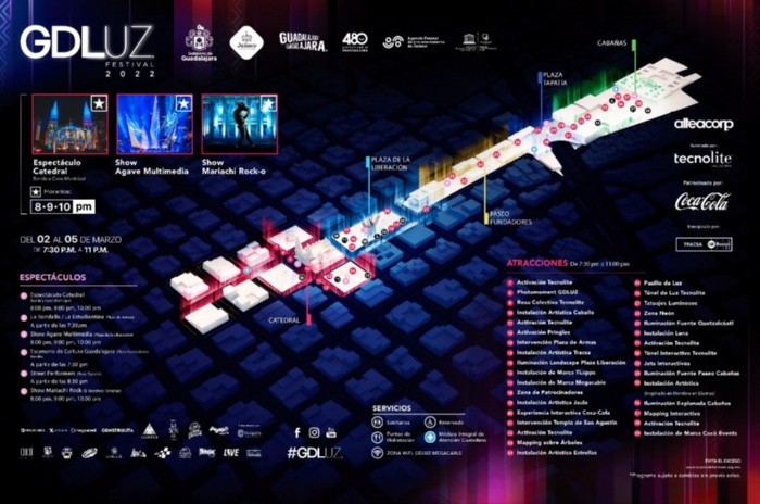 Este domingo por fin fue dado a conocer el programa general del Festival GDLuz, que se llevará a cabo del 2 al 5 de marzo como parte de las festividades en torno al 480 aniversario de Guadalajara.Fue a través de su cuenta de Twitter que el gobernador de Jalisco compartió dicha programación, de este espectáculo de luces, que se celebra en la ciudad desde 2017, y que por motivo de la contingencia por el COVID-19, tuvo que suspender su presencialidad en 2021.Según lo publicado en su plataforma oficial, el festival contempla más de 30 atracciones de luces y música que tendrán lugar entre las 19:30 y las 23:00 horas.Entre ellas se encuentran diversas activaciones y experiencias interactivas por parte de las marcas patrocinadoras en todo el corredor que compone GDLuz; la iluminación Landscape de la Plaza Liberación; Mapping sobre los árboles y un pasillo de luz en el Paseo Fundadores; la aplicación de tatuajes luminosos y una zona neón en la Plaza Tapatía, así como la iluminación especial de la Fuente de Quetzalcóatl y de la fuente del Paseo Cabañas.También se montará una instalación artística inspirada en el Hombre en Llamas de José Clemente Orozco en la zona del Museo Cabañas y se iluminará su explanada, sin dejar de lado el Mapping interactivo que ahí se presentará.Como ya se había adelantado, se contará con seis espectáculos especiales: el primero, se presentará en la Catedral de Guadalajara, donde habrá una banda y cantará el coro municipal cada hora de las 20:00 a las 22:00 horas, mientras que en la Plaza de Armas, a partir de las 19:30 se contará con la participación de una Rondalla y una Estudiantina.El tercer show es el ya conocido, aunque con nuevos atractivos, Show de Agave Multimedia, que se montará en la Plaza Liberación. Las y los asistentes podrán disfrutar de este espectáculo a las 20:00, 21:00 y 22:00 horas.En el Escenario de Cultura Guadalajara, instalado en la Plaza Fundadores, detrás del Teatro Degollado, las y los visitantes podrán disfrutar de diversas bandas, mientras que en la Plaza Tapatía se contará con la participación de "Street performers" o artistas callejeros a partir de las 20:30 horas.Por último, considerado como el gran cierre del recorrido, se tendrá el Show de "Mariachi Rock-O", que podrá ser disfrutado por las y los asistentes a GDLuz cada hora entre las 20:00 y las 22:00 horas.Además de los shows y atracciones GDLuz también tendrá diversos servicios para que la ciudadanía pueda disfrutar mejor el festival, como puntos de hidratación, lugares reservados para personas con discapacidad, sanitarios, zona WiFi y un módulo Integral de Atención Ciudadana.De acuerdo con lo anunciado por el gobernador, será este lunes cuando, en conjunto con la Agencia Estatal de Entretenimiento y el ayuntamiento de Guadalajara, se den a conocer todavía más detalles sobre el evento.Como se adelantó a este medio de comunicación por parte de la coordinadora de Construcción de Comunidad del ayuntamiento de Guadalajara, Andrea Blanco, dentro de las atracciones que tendrá GDLuz se contempla un un breve homenaje al cantante tapatío, Vicente Fernández, quien falleció el pasado 12 de diciembre.En esta nueva edición presencial, añadió, se espera la asistencia de alrededor de 1.4 millones de personas durante los cuatro días del festival, quienes podrán disfrutar de los dos kilómetros de actividades que tendrá la celebración.JL