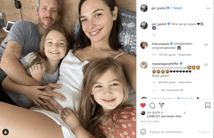 Gal Gadot ha dado a conocer esta mañana que por tercera vez está embarazada.Gadot compartió en redes sociales una fotografía de ella junto a sus hijas, Alma y Maya, y su esposo, el empresario Jaron Varsano, sentados mientras cada miembro de la familia colocan una mano en el vientre de la protagonista de “Mujer Maravilla”.La publicación ha superado los dos millones de "me gusta" y los fans de la también actriz de "Rápidos y Furiosos", así como seguidores del universo cinemá de DC, le han externado sus felicitaciones porque su familia se volverá más grande.Entre los mensajes no faltaron quienes le desearon que tenga un niño, esto luego que la intérprete de Diana Prince ha tenido únicamente mujeres.La última cinta que ha estrenado Gal Gadot se trató de la secuela de su "Wonder Woman 1984", cinta de Patty Jenkins que vio retrasado su estreno debido a la pandemia de COVID-19.El largometraje, por el cual Gadot habría ganado 10 millones de dólares, llegó de forma simultánea a cines y HBO Max la pasada Navidad."Sentimos que no teníamos una alternativa mejor. Y es interesante porque rodamos la película en 2018 y, obviamente, no podríamos haber anticipado 2020, pero ahora la película se siente más relevante que nunca", dijo Gal Gadot en una ocasión a propósito de lo que significó el estreno de "Wonder Woman 1984.AC