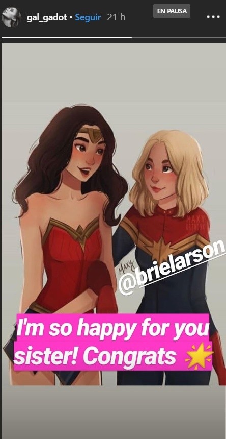 A pesar de que encarnan a dos superheroínas de las dos casas "rivales" más importantes de los comics en el mundo, Gal Gadot felicitó a Brie Larson por su gran éxito en taquilla que tuvo "Capitana Marvel" este fin de seman.Quien toma el papel de "Mujer Maravilla" (DC Comics) reconoció el trabajo que realizó Larson en la cinta donde da vida a "Carol Danvers", la primera heroína del mundo de Marvel que tiene su película."Estoy feliz por ti hermana, felicidades", escribió la actriz en una de sus Instagram Stories."Capitana Marvel" levantó una durmiente taquilla el fin de semana pasado al recaudar 455 millones de dólares a nivel mundial y con esto se posicionó como uno de los mejores estrenos que ha tenido Marvel Studios.Por otro lado, Gal Gadot terminó a finales del año pasado de filmar "Wonder Woman 1984", cinta que se espera llegue a las salas de cine en el 2020.AC