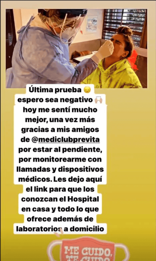 Galilea Montijo se recupera en casa tras dar positivo su resultado de coronavirus hace unos días, sin embargo, la conductora de “Hoy” se sometió a una nueva prueba que espera salga negativa, al igual que su compañero de set Paul Stanley.Fue a través de redes sociales que Galilea posteó un estado en el que aparece sometiéndose a la prueba, con gestos demuestra lo incómodo que resulta, pero lo único que Montijo quiere es librarse por completo de esta enfermedad que ha cobrado la vida de 100 mil personas en México.La conductora expresó que se ha sentido mejor, y agradeció los monitoreos y las atenciones médicas que han tenido con ella, así como que le hayan aplicado una nueva prueba desde la comodidad de su hogar."Última prueba espero sea negativo hoy me sentí mucho mejor, una vez más gracias a mis amigos de @mediclubprevita por estar al pendiente, por monitorearme con llamadas y dispositivos médicos. Les dejo aquí el link para que los conozcan en Hospital en casa y todo lo que ofrece además de laboratorios a domicilio", se lee.Montijo agradeció a sus fans y seguidores las muestras de apoyo y cariño, así como los mensajes de aliento para que pronto se recupere y vuelva al programa matutino.El también conductor en “Hoy”, Paul Stanley, de igual manera se sometió a una nueva prueba, en su caso, la quinta, tras dar positivo a coronavirus.En sus “stories” de Instagram compartió cómo le aplicaron las pruebas y lo desagradable que fue la "violación nasal".En el programa matutino de Televisa, ya son varios los conductores que han salido contagiados de COVID-19, entre ellos Andrea Legarreta, Andrea Escalona, Andrea Rodríguez, Galilea Montijo y Paul Stanley.AC
