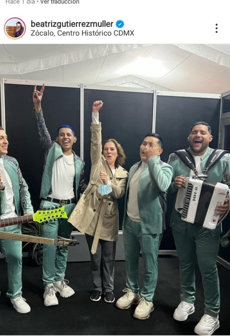 La esposa del Presidente Andrés Manuel López Obrador (AMLO), Beatriz Gutiérrez Müller, se declaró en redes sociales como fan de Grupo Firme, ya que en sus redes sociales compartió fotografías con los miembros de la banda y un video del concierto en el Zócalo de la Ciudad de México (CDMX).La escritora se reunió con el vocalista de la banda, Eduin Caz, y su esposa Daisy Anahy.Grupo Firme se presentó en un evento gratuito el pasado domingo 25 de septiembre en el Zócalo, donde asistieron más de 280 mil personas.En Instagram, Beatriz Gutiérrez calificó el concierto como “impresionante” y se dijo contenta por la presentación de la agrupación.Se mostró como conocedora de las canciones de Grupo Firme, pues compartió una de las más famosas en sus redes sociales.“Fue un concierto impresionante el de Grupo Firme. ¿Que rompió el récord al reunir 280 mil personas? Yo sentí como a un millón… ¡Me alegra mucho que la gente sea feliz cantando! Todo un equipazo que hizo tronar al zócalo de la Ciudad de México", comentó en sus redes.Beatriz Gutiérrez dijo que fue un gusto saludar a los integrantes de la banda y los y calificó como: “auténticos, agradecidos y sencillos”.Por último, Beatriz Gutiérrez agradeció a Grupo Firme por alegrar a tanta gente con su concierto y les deseo que continúen cosechando éxitos, mientras externó su “cariño chilango”, hacia ellos.