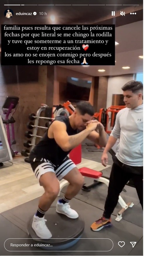 La tarde de este martes, Eduin Caz, vocalista de Grupo Firme anunció en sus redes sociales que algunos de los conciertos de su gira que estaban programados en México y Estados Unidos tendrán que ser cancelados, esto luego de que el cantante atraviesa por algunos problemas con su rodilla. Fue a través de una historia publicada en la cuenta de Instagram del cantante donde dio a conocer dicha información, explicando que tiene problemas en una de sus rodillas y por consejo médico no podrá presentarse en los escenarios por unos días, además de que se está rehabilitando con ciertos ejercicios en el gimnasio. "Familia, pues resulta que cancelé las próximas fechas porque, literal, se me chingó la rodilla y tuve que someterme a un tratamiento y estoy en recuperación", escribió el cantante junto a un video de una de sus terapias.En las imágenes se puede ver al famoso realizando algunos ejercicios con ayuda de su terapeuta y el evidente dolor que muestra en el rostro deja más que claro que no se encuentra bien, físicamente hablando.Asimismo, pidió a sus fans comprensión en estos momentos y prometió que muy pronto retomará estos compromisos: "Los amo, no se enojen conmigo, pero después les repongo esa fecha", agregó.Esta no es la primera vez que el intérprete de éxitos como "Ya supérame" se enfrenta a problemas de salud, hace algunas semanas fue internado de emergencia debido a la hernia hiatal que padece y que se complicó por su manera de beber.MF