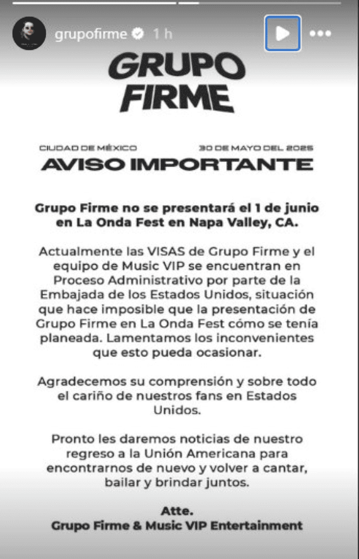 Grupo Firme informó que el concierto previsto para el 1 de junio en Napa Valley, California, ha sido cancelado, ya que sus visas aún están en trámite administrativo.A través de un comunicado en sus redes sociales, la agrupación explicó: "Actualmente, las visas de Grupo Firme y del equipo de Music VIP están en proceso administrativo por parte de la Embajada de Estados Unidos, situación que imposibilita la presentación de Grupo Firme en La Onda Fest, como se tenía planeado". Los intérpretes de "Ya supérame" ofrecieron disculpas a sus seguidores que esperaban asistir al evento y aseguraron que pronto darán noticias sobre su regreso a Estados Unidos, con el deseo de "reencontrarnos y volver a cantar, bailar y brindar juntos".Grupo Firme no ha sido el único grupo de música regional mexicana con problemas de visas; artistas como Julión Álvarez y Los Alegres del Barranco también enfrentaron situaciones similares.MF