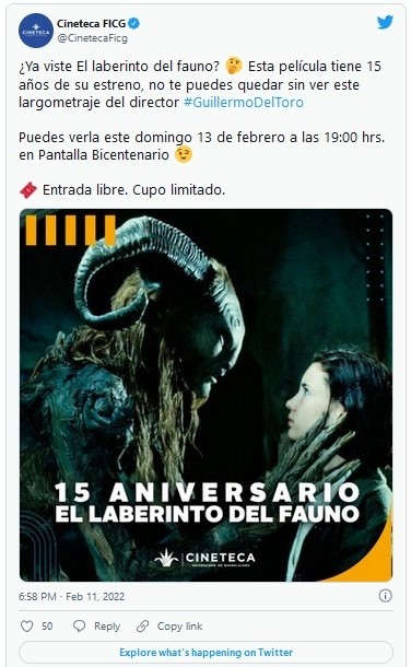 La Cineteca FICG ha decidido dedicar parte de su programación a la filmografía del cineasta tapatío Guillermo del Toro, y además de tener en su cartelera en sala la más reciente película “El callejón de las almas perdidas” (Nightmare Alley), nominada en diversas categorías al Oscar 2022, también se proyectarán otras destacadas historias dirigidas por Del Toro.El pasado 6 de febrero, la Cineteca FICG proyectó gratuitamente “Blade II” en la Pantalla Bicentenario, y este fin de semana se suman dos filmes más de Del Toro con “Hellboy”, que será proyectada hoy a las 19:00 horas, en tanto que mañana –domingo 13 de febrero- será “El Laberinto del Fauno” la trama que se comparta gratuitamente al público, que podrá acceder libremente a la explanada de la cineteca, aunque se anuncia que hay cupo limitado por medidas COVID.La Cineteca FICG ha anunciado a estas proyecciones como parte del “Ciclo Guillermo del Toro”, para que los fans puedan recordar parte de la filmografía del cineasta tapatío que ha cosechado importantes galardones de los Globos de Oro y el Oscar por películas como “La Forma del Agua”.En el caso de “El Laberinto del Fauno”, la Cineteca recordó que el este filme -protagonizado por Ivana Baquero, Maribel Verdú, Sergi López y Doug Jones- cumple 15 años de haber llegado a la pantalla y lograr seis nominaciones al Premio Oscar, de las cuales ganó en las ternas de mejor fotografía, mejor dirección artística y mejor maquillaje, en la ceremonia de la Academia de 2007, entre otros reconocimientos que se le hicieron en los premios Goya y los BAFTA.La proyección gratuita de “El Laberinto del Fauno” será este domingo 13 de febrero a las 19:00 horas en la Pantalla Bicentenario. Ingreso libre y con cupo limitado. Consulta más información en Facebook.com/CinetecaFICG/, en donde también se estarán anunciado más filmes para el “Ciclo Guillermo del Toro”.JM