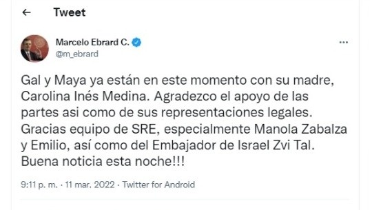 Luego de que el cineasta tapatío Guillermo del Toro solicitara mediante un tuit ayuda a Marcelo Ebrard, titular de la Secretaría de Relaciones Exteriores (SRE) para apoyar a dos niñas que pretendían llevarse a Israel sin consentimiento de su madre, el funcionario solicitó que se revisara el caso y ellas volvieron a casa."Ya boletinado en el Aeropuerto CDMX, no permitir el abuso. Es la instrucción que tenemos", respondió Ebrard.Ayer, Marcelo Ebrard informó que las menores Gal y Maya, sobrinas de Nicolás Celis, productor de la película Roma, ya se encuentran con su madre Carolina Inés Medina. “Gal y Maya ya están en este momento con su madre, Carolina Inés Medina. Agradezco el apoyo de las partes así como de sus representaciones legales”, escribió el canciller en Twitter."¿Alguien puede ayudar con esto?", fue el tuit que escribió el cineasta Guillermo del Toro, donde añadió la cuenta de Marcelo Ebrard y de la SRE.Lo anterior lo hizo en apoyo al productor Nicolás Celis ("ROMA" y "Noche de fuego") quien denunció que a sus sobrinas se las querían llevar, por la fuerza: "Están a punto de quitarle a sus hijos a mi hermana y mandarlas express a Israel después de que hemos sobrevivido toda la corrupción y que ella tiene la guardia y custodia en ambos países", escribió.