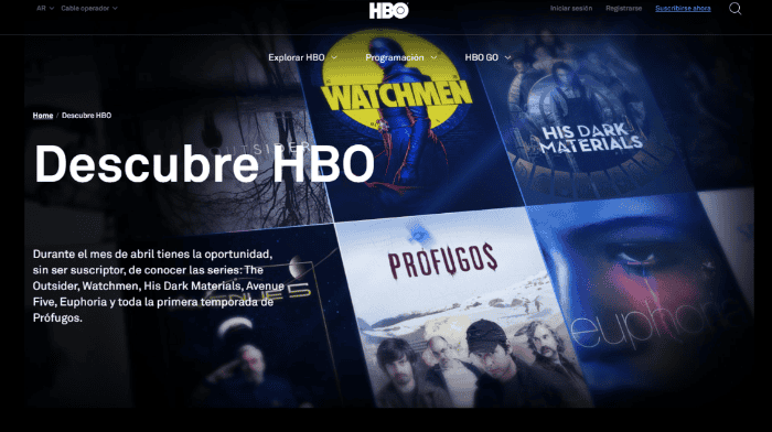La plataforma HBO GO ofrece contenidos digitales ahora también en América Latina para ayudar pasar el aislamiento en casa.El servicio de entretenimiento, que no pide un registro ni costo a los usuarios que deseen disfrutar de contenidos seleccionados, ofrecerá este beneficio hasta el fin de este mes. Entre los contenidos seleccionados por HBO, se encuentran la primera temporada completa de “Sex and The City” y las dos primeras temporadas de “The Sopranos”.“Avenue 5”, “Euphoria”, “His Dark Materials”, “The Outsider” y “Prófugos” son otros títulos disponibles en las plataformas del servicio.“Para acceder a esta selección de contenidos, no es necesario ser suscriptor de HBO. Simplemente será suficiente descargar la aplicación o ingresar a la página web”, detalló la firma digital.A principios de este mes, HBO abrió contenido de entretenimiento gratuito para su público de Estados Unidos, y ahora lo habilita para el resto del continente y así sumarse a la lista de firmas que apoyan a los ciudadanos a sobrellevar los días mientras pasan en casa debido a las medidas por el COVID-19.Para ingresar al sitio, puedes dar clic aquí.AC