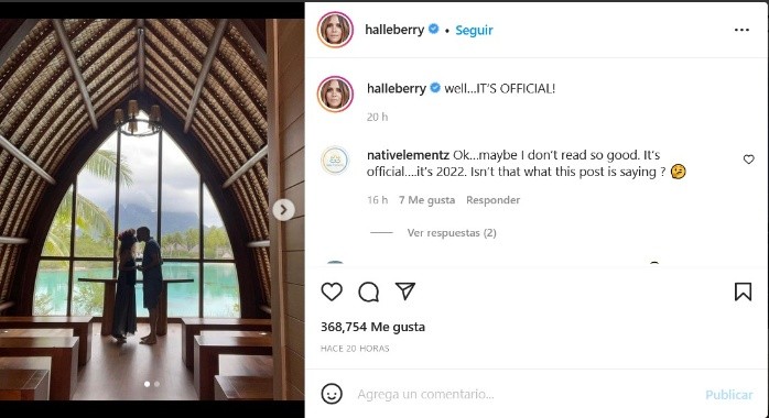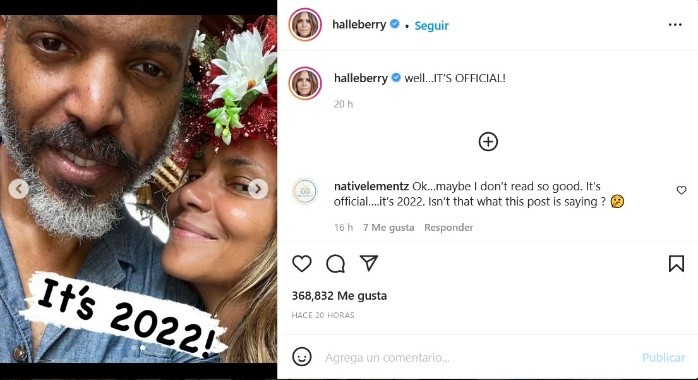 La actriz Halle Berry sorprendió a todos con una reciente foto con su novio Van Hunt, cantante de R&B, en un altar de alguna capilla dándose un beso a contraluz, la cual acompañó con el mensaje "Bueno, es oficial".Tanto seguidores como amigos mostraron su felicidad ante la publicación en Instagram, uno de ellos fue Dwayne Johnson "La Roca", quien escribió "Felicidades a los dos. Hermoso". Octavia Spencer también felicitó a la pareja y se sumaron artistas como Naomi Campbel y Lesley-Ann Brandt......Lamentablementeo, todos cayeron en la trampa, pues en la siguiente foto compartió una selfie que complementa la frase "Bueno, es oficial"… "Es 2022", lo que indicó que todo fue una broma.En cuanto al matrimonio, no se sabe si esta pareja planea hacerlo, ya que Berry ha estado casada tres veces: con David Justice (1993 a 1997), Eric Benét (2001 a 2005) y Oliver Martínez (2013 a 2016), con quien tuvo a su segundo hijo Maceo Martínez.También tuvo una larga relación problemática, sin matrimonio, con el modelo Gabriel Aubry que terminó en una tortuosa batalla legal por la custodia de Nahla Ariela Aubry, su primera hija. La pareja Berry-Hunt comenzó a salir oficialmente en septiembre del 2020, pero ya llevaban algunos meses más conociéndose.JM