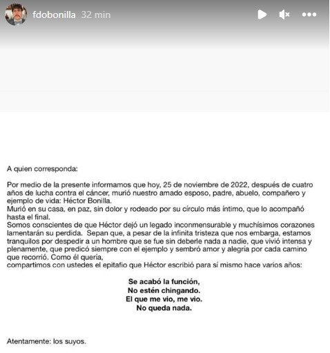 Este viernes 25 de noviembre, el famoso actor mexicano, Héctor Bonilla falleció a los 83 años, así lo dio a conocer la Secretaría de Cultura a través de su cuenta de Twitter. Fernando Bonilla, hijo del famoso actor mexicano, también dio a conocer el fallecimiento de su padre a través de un comunicado publicado en una historia en su cuenta de Instagram, mencionando que después de cuatro años luchando contra el cáncer de riñón falleció.“Por medio de la presente informamos que hoy, 25 de noviembre de 2022, después de cuatro años de lucha contra el cáncer, murió nuestro amado esposo, padre, abuelo, compañero y ejemplo de vida: Héctor Bonilla. Murió en su casa, en paz, sin dolor y rodeado por su círculo más intimo, que lo acompañó hasta el final", se lee en el comunicado. A pesar de que sufría de cáncer y que no existía quimioterapia alguna para vencerlo, Héctor se negó a dejar se trabajar y siguió con sus compromisos asegurando que estaba "viviendo días extra"."El 14 de marzo cumplí 83 años, así que se puede decir que estoy viviendo horas extras, y las he vivido muy contento. Si puedo vivir 10 años más, sería una propinota que me dará la vida, pero no estoy angustiado ni estoy azotado; simplemente quiero seguir trabajando en lo que hago: escribir, dirigir, actuar y cumplir mi ciclo. Con eso estoy más que satisfecho", dijo el Héctor en una entrevista.El actor nacido en Tetela de Ocampo, Puebla brilló por sus grandes presentaciones en televisión, cine y teatro, además hace poco fue homenajeado por su hijo Fernando Bonilla tras su presentación de teatro con la obra, ‘El corrido del rey Lear’.Entre las películas más destacadas que participó Héctor Bonilla se encuentran: Patsy mi amor (1968), Los hijos de Sánchez (1978), Meridiano 100 (1970), Matinée (1976), María de mi corazón (1980), Serpientes y Escaleras (1991) La leyenda de una máscara (1989) y Ámbar (1992).MF