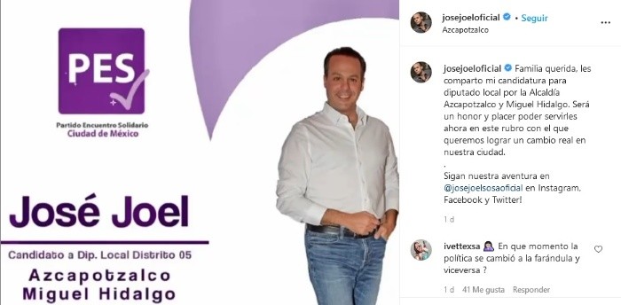 Con el inicio de las campañas electorales 2021 más figuras públicas que pertenecen al mundo del espectáculo han dado a conocer que aspiran a un puesto. Este fin de semana el cantante José Joel, hijo José José, así como Ignacio Peregrín, hermano de Belinda, compartieron sus candidaturas con sus seguidores.El primogénito del "Príncipe de la Canción" es candidato a diputado local del Distrito 05, Azcapotzalco-Miguel Hidalgo, de la mano del Partido Encuentro Solidario (PES)."Será un honor y placer poder servirles ahora en este rubro con el que queremos lograr un cambio real en nuestra ciudad", escribió el intérprete de 45 años para dar a conocer su aspiración política, a la vez que invitó a todos sus seguidores a continuar a su lado en esta aventura. Varios de los usuarios de la red social mostraron su sorpresa y escepticismo por su candidatura. Incluso algunos criticaron el que haya tantas personas de la farándula en medio de las campañas políticas."¿Qué barbaridad tantos cantantes, actores, luchadores, porteros , en la política cual seriedad?", "¿En qué momento la política se cambió a la farándula y viceversa?" y "¿Que estudios tienes para querer ostentar este puesto?" fueron algunos de los mensajes que recibió José Joel; no obstante, también hubo gente que demostró su apoyo y le deseó lo mejor en la contienda electoral.El clip cuenta con más de 13 mil reproducciones y más de 100 comentarios.Belinda estuvo muy alegre el fin de semana luego que dio a conocer que su hermano, Ignacio Peregrín, es candidato a una diputación federal por el Distrito XV Benito Juárez."Nacho" Peregrín, de la mano de la coalición Morena-PT y Partido Verde, compartió el mensaje que le dedicó la cantante de "Luz sin Gravedad", en el que se dijo orgullosa porque da muestra de lo tanto por lo que ha trabajado.En su cuenta de Instagram el candidato, con 271 mil seguidores, compartió la imagen de su propaganda acompañada de una canción donde aborda distintos tópicos de interés para los mexicanos, como la seguridad, lo que viven las mujeres en el país y la forma en que en manos de los jóvenes está una reconstrucción."México te quiere", escribió "Nacho" Peregrín en su publicación.jb