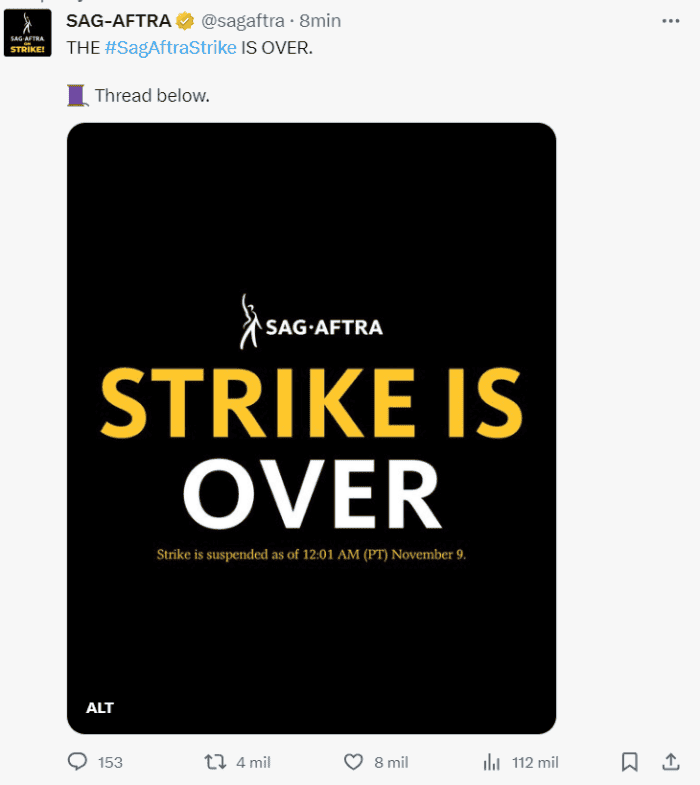 Luego de casi cuatro meses de huelga, el sindicato de actores de Hollywood finalmente llegó a un acuerdo tentativo con los estudios este miércoles, mismo con el que se concluiría la disputa laboral que por meses provocó una parálisis histórica en el sector del entretenimiento.Aún falta que el acuerdo contractual por tres años sea aprobado en votaciones de la junta directiva sindical y sus miembros en los próximos días, pero de todas formas los líderes declararon que la huelga llegará a su fin a las 12:01 de la madrugada del jueves.De momento los términos del acuerdo no fueron dados a conocer, pero el SAG-AFTRA indicó que los detalles se harán públicos luego de una reunión que se llevará a cabo el viernes, en la que los integrantes de la junta revisarán el contrato. Los temas sobre la mesa incluyeron la compensación a corto plazo y pagos de regalías en el futuro por desempeños en el cine y la televisión, al igual que el control de las imágenes de los actores y sus retratos generados con inteligencia artificial.Ejecutivos de las principales compañías de entretenimiento, incluidas Disney, Netflix, Universal y Warner Bros. Discovery, intervinieron directamente en las negociaciones, que, al igual que todas las conversaciones sindicales de Hollywood, estuvieron encabezadas por la Alianza de Productores de Cine y Televisión.El anuncio del fin de la huelga ocurrió horas después de que el director general de Disney, Robert Iger, y el de Warner Bros. Discovery, David Zaslav, reportaron sus estados financieros más recientes. Ambos ejecutivos dijeron albergar esperanzas de que el paro se solucionaría pronto.Las acciones de Disney ganaron terreno con base en su informe, en el que señaló que su ingreso neto se incrementó 63%, a 264 millones de dólares, en el trimestre que concluyó el 30 de septiembre, con respecto a 162 millones de dólares un año antes. En una llamada telefónica sobre los ingresos, Zaslav dijo que la última oferta de los estudios "cumplía prácticamente con todos los objetivos del sindicato e incluye la mayor alza salarial en 40 años".Warner Bros. Discovery reportó pérdidas. Sus acciones descendieron 19% el miércoles.Cabe recordar que esta huelga de actores de cine y televisión fue por mucho la más larga en la historia de Estados Unidos.Más de 60.000 integrantes del Sindicato de Actores de la Pantalla-Federación Estadounidense de Artistas de Televisión y Radio (SAG-AFTRA, por sus siglas en inglés) entraron en paro el 14 de julio, uniéndose a guionistas que habían dejado de trabajar más de dos meses antes.Fue la primera ocasión en que los dos sindicatos estuvieron en huelga al mismo tiempo desde 1960. Los estudios eligieron negociar primero con los escritores, alcanzando un acuerdo que sus líderes consideraron un gran triunfo, por lo que pusieron fin a su huelga el 26 de septiembre.Sigue al día con las noticias, únete a nuestro canal de WhatsAppYC
