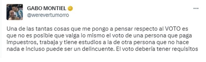 Gabriel Montiel, youtuber conocido como Werevertumorro, fue calificado por usuarios de redes sociales como clasista tras generar polémica respecto al voto en México. El hermano de "El Escorpión Dorado" empleó sus redes sociales para reflexionar respecto a este tema y lanzó una comparación que le valió críticas."Una de las tantas cosas que me pongo a pensar respecto al VOTO es que no es posible que valga lo mismo el voto de una persona que paga impuestos, trabaja y tiene estudios a la de otra persona que no hace nada e incluso puede ser un delincuente. El voto debería tener requisitos", escribió.La opinión del youtuber, nacido en Huehuetoca, generó críticas de usuarios de redes sociales quienes lo calificaron de clasista."Qué bueno que eres youtuber y no legislador", "Goeee ahora sí te la bañaste con esto, hay que ponerle más materia gris a lo que se va a decir y hacer"; "mi amigo el menos clasista"; "entonces si eres pobre no puedes votar el candidato q te ofrece oportunidades para salir de una mala situación entre comillas y eso que dices es literalmente oligarquía", "eso sonó muy clasista".La opinión emitida a través de la plataforma Twitter ya cuenta con más de tres mil 500 "Me Gusta" en dicha red social y cientos de comentarios.Gabo Montiel también opinó sobre la reducción de la edad para que los jóvenes sean diputados, iniciativa que se aprobó en la Cámara de Diputados el pasado martes."Es súper polémico el tema de que ahora puedes ser diputado a los 18 años… Hay un montón de cosas que están mal desde hace tiempo, pero nunca se les ha puesto atención: Ejemplo: El representante electo puede tener 40 años sin estudios de primaria o secundaria. ¿cuál otra?", cuestionó.El youtuber Gabo Montiel empleó sus redes sociales para opinar sobre la reducción en la edad mínima para ser diputado.En una entrevista que Gabo Montiel le dio a Yordi Rosado en 2022 contó que en un inicio trabajaba en una agencia como editor, actividad que intercalaba con grabar y subir videos a la plataforma hasta el momento en que le dijeron que ya podía ganar dinero."Me puse a hacer muchos videos y veo y eran como 15 dólares, o sea de mis 200 videos eran como 15 dólares", contó el youtuber.En ese momento tomó como punto de partida hacer el número de videos suficiente que le permitieran obtener seis mil pesos en ganancias, la misma cantidad que ganaba como editor de una casa productora.El youtuber creó uno de los grupos de creadores de contenidos más éxito en México junto a su hermano Alejandro Montiel, conocido como Escorpión Dorado; Luis Torres, Luisitorey; Israel Rivera (Isra); Félix Meza (Fex), entre otros.MF