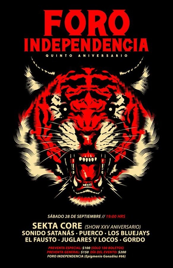 Cinco años se dicen fácil, sin embargo para el Foro Independencia han sido de trabajo constante por ser hogar de géneros tanto mainstream como subterráneos; del pop al death metal, aquí no hay distinción, la puerta está abierta para todos y el primer lustro del recinto lo deja muy en claro, mismos que se celebrarán con un concierto especial este 28 de septiembre que tendrá de protagonistas a Sekta Core, Sonido Satanás, Gordo, Juglares y Locos, Los Bluejays & El Fausto.El “venue” que nació de la iniciativa de Jesús González Weeks y dos socios más se ha posicionado poco a poco como un referente de la metrópoli y eso lo señala orgulloso Weeks. “Cada vez hay menos cabello, más arruga, el tema de las finanzas nunca es fácil, vivir de las industrias culturales es difícil, pero estamos muy contentos de que el sueño se mantenga, satisfechos con lo que hemos hecho, siempre estamos pensando en el futuro, en las mejoras del lugar. Estamos en proceso de mejorar baños, escenarios, audio, iluminación, siempre buscando una mejor experiencia tanto para el público como para los promotores”.En cuanto al talento que conformará el show de aniversario, quien también es integrante de la banda Los Malavibra, comparte: “Sekta Core tenía una fecha dos semanas después (al aniversario), les comentamos la idea de que se presentarán en el aniversario y se prendieron, se emocionaron para apoyar, son amigos que tocan una vez al año, además ellos también vienen celebrando sus XXV años de trayectoria, en cuanto a las otras bandas son agrupaciones de casa, tocan muy seguido, los invitamos y gustosos aceptaron, más artistas querían estar, pero por el espacio y logística no se pudo”.El 9 de julio del presente año se presentaría en el lugar la banda de metal Eyehategod; sin embargo, a unas cuadras del recinto el baterista de la agrupación sufrió un asalto perpetrado por cuatro personas, durante el cual fue lastimado con una navaja en el costado izquierdo. El hecho fue completamente aislado de la logística del Foro y nada tuvo que ver con la seguridad del mismo, un accidente, que por desgracia es causa de la inseguridad que no han podido acabar las autoridades. “Somos un lugar que nunca hemos tenido algún problema, nunca nos han clausurado, siempre hemos respetado a las personas, no es menos importante la religión, sexualidad, color, aquí todos son respetados por igual. Lo que sucedió en esa ocasión fue a cinco cuadras y pasa por temas más de seguridad pública que del lugar. Nos ubicamos en la zona de Mexicaltzingo, estamos al lado de la PGR, por ese lado queda sustentado que seguridad hay. Lo que tenemos que hacer es todos cambiar de mentalidad, hay que reactivar el Centro y que cada quien haga lo que le toca, a nosotros nos toca generar un espacio donde se puedan divertir”, finaliza.La celebración en el Foro Independencia abrirá sus puertas a las 19:00 horas. Boletos: 150 pesos. Ubicación: Epigmenio González 66, Col. Mexicaltzingo.