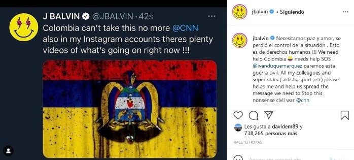 "Han sido unos días muy difíciles, muy tristes, llenos de mucha tristeza", reflexiona el cantante J Balvin en el marco de las protestas que se han desarrollado en su país, Colombia. En los últimos días se vivió una jornada de manifestaciones en Cali en contra de la reforma tributaria, que terminaron con la policía abriendo fuego y matando e hiriendo a decenas de personas.Al respecto, el intérprete ha sido de las celebridades que se han pronunciado a través de sus redes sociales pidiendo ayuda para su gente.Ahora que se prepara para estrenar el documental "El niño de Medellín", que el próximo 7 de mayo llega a Amazon Prime Video, comparte lo que siente por ver la violencia que vive su país."Aquí estamos dando toda la mejor energía y buscando la manera que podamos hacer algo para que esto termine ya", señala.El intérprete del género urbano espera que a través de su música y en su labor como artista pueda llevar un mensaje de esperanza a sus seguidores, sobre todo pensando en que el mundo también sigue atravesando por una pandemia."(El reggaetón) es un género que trae mucha alegría, mucha felicidad, necesitamos contagiar al mundo de eso nuevamente". En ese sentido el intérprete de "Mi gente" adelanta que está haciendo mucha música para poder llevar su buena vibra al mundo."Toda Latinoamérica necesita ayuda, y no se nos olvide que fuera de lo que está pasando en este momento, solamente en Colombia, todavía seguimos en medio de una pandemia donde no hay vacunas suficientes para el mundo entero y es una gran preocupación también".El largometraje de José Álvaro Osorio Balvín, nombre real del colombiano, fue dirigido por Matthew Heineman, nominado al Oscar en la categoría Mejor documental largo, y sigue al cantante mientras se preparaba para un concierto que ofrecería en su natal Medellín, Colombia, y que considera el más importante de su carrera, realizado también en un momento de inestabilidad política en su país."Quiero invitarlos a que vean este documental, que vean parte de la realidad de José, del niño de Medellín".jb