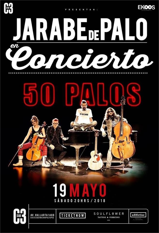 Festejando 20 años de trayectoria y 50 de su vocalista Pau Donés, Jarabe de Palo regresa a los escenarios de Guadalajara para presentarse el 19 de mayo en el C3 Stage.La agrupación española llegará a la Perla Tapatía con su '50 Palos Tour' (en honor al natalicio de Dónes), donde repasará la celebración de su más reciente disco doble que hace un recapitulación a sus nueve producciones de carrera.'50 Palos', reúne 22 canciones del grupo con nuevos arreglos a piano, de cuerda, contrabajo, bases programadas y percusión.La agrupación de rock y pop rock española Jarabe de Palo se formó en 1996 y se dio a conocer con el exitoso tema “La Flaca”, que formó parte de su primer álbum titulado de igual manera. La banda está integrada por su líder y vocalista Pau Donés junto a Alex Tenas, Jimmy Jenks, Jaime de Burgos, Jordi Vericat y David Muñoz.Los boletos salen a la venta a partir del lunes 15 de enero y los puedes conseguir en taquillas del C3 Stage (Av. Vallarta 1488 Guadalajara) así como en tiendas Soulflower y TicketNow México.