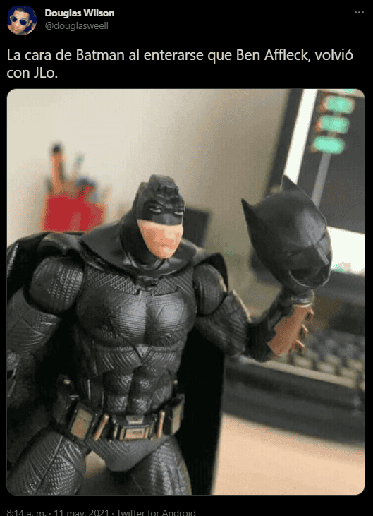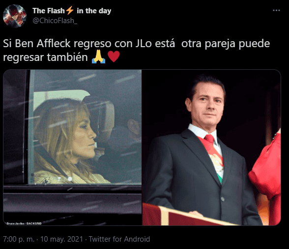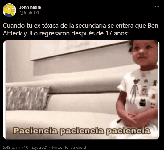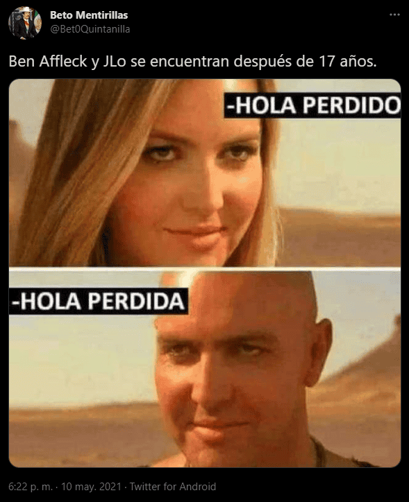Tras el anuncio de la supuesta reconciliación entre Jennifer López (JLo) y Ben Affleck, algunos usuarios en redes sociales compartieron memes y reacciones sobre la pareja. Cabe recordar que la cantante acaba de terminar su relación con el beisbolista Alex Rodríguez. De acuerdo con E! News, Affleck y JLo se tomaron unas vacaciones de una semana en Yellowstone Club en Montana luego de haber asistido, por separado, a un concierto de VAX Live.“Ben Affleck y JLo se encuentran después de 17 años”, “Si Ben Affleck regreso con JLo está otra pareja puede regresar también Manos palma contra palmaPalo de corazones” y “Si Ben Affleck ha vuelto con JLo, ya va siendo hora de que vuelvan ellos dos”, son algunos de los comentarios en Twitter.Recientemente se dio a conocer que Jennifer López y Alex Rodríguez terminaron su relación luego de cuatro años juntos y ya un compromiso en puerta.Affleck y López han tenido contacto desde hace tiempo, luego de haber terminado su relación en 2004.La pareja se conoció en 2002 durante la filmación de “Gigli”.AC