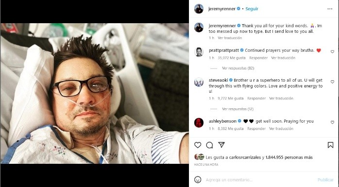 A través de sus redes sociales, el actor Jeremy Renner reapareció luego de que se diera a conocer que estaba en estado delicado de salud al sufrir un aparatoso accidente cuando maniobraba una máquina quitanieve en su domicilio, en Nevada, causándole lesiones severas en su pierna y tórax, según trascendieron en los primeros reportes médicos difundidos.Con un mensaje breve, el histrión de 51 años de edad compartió una fotografía con sus seguidores mostrándose con moretones y raspones en el rostro, que evidentemente luce hinchado y siendo apoyado por un respirador.“Gracias a todos por sus amables palabras”, escribió el actor para acompañar su fotografía, en la que aseguró que le cuesta trabajo escribir de momento; sin embargo, puntualizó ser recíproco con el amor y cariño que le han manifestado sus fans.Ante el post del actor, que ha figurado como una de las estrellas de la saga de “Avengers” en el Universo Cinematográfico de Marvel, dando vida a “Hawkeye”, los fans no se han limitado en expresarle cariño y deseando que su recuperación sea lo más rápido posible con la esperanza que sus lesiones no tengan consecuencias permanentes.Compañeros del gremio como el actor Chris Hemsworth, quien da vida a “Thor”, rápidamente también se sumaron a los buenos deseos expresándole su amistad y el deseo de verlo pronto recuperado.De igual forma se han manifestado Chris Patt, quien interpreta a “Star Lord”, la mexicana Eiza González, y hasta el director Taika Waititi y el DJ Steve Aoki, quienes han refrendando que Jeremy es un verdadero superhéroe y que saldrá victorioso de este complejo accidente.Trascendió que tras la maniobra de la máquina, Jeremy fue impactado por el aparato prácticamente arrollándolo, sin embargo, el actor no ha manifestado una versión oficial de los hechos y cómo es que realmente ocurrió el percance, que de inicio se manejó con información que alertó a los fans, pues se destacó que el histrión estaba delicado de salud, aunque en un proceso estable en su traslado al hospital para recibir los primeros auxilios, luego de un vecino se percató del hecho y habría ayudado a detener una hemorragia que ponía en riesgo la vida del actor.En redes sociales se dio a conocer cómo el actor fue trasladado vía aérea al hospital ante las complicaciones climáticas, pues en las últimas semanas se ha presentado una nevada histórica en Estados Unidos y Canadá.CR
