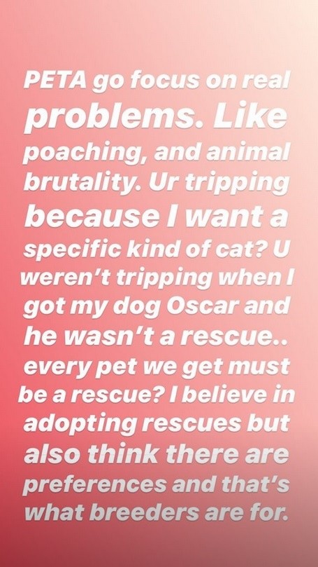 El cantante Justin Bieber ha estado disfrutando en días recientes de su boda por la iglesia al lado de la modelo Hailey Baldwin, aunque su felicidad se ha visto alterada luego que la organización PETA, que lucha por los derechos de los animales, lo criticó por comprar dos gatos exóticos por 35 mil dólares.El intérprete de "I Don't Care" escribió en sus historias de Instagram dos publicaciones en las que arremetió contra la organización y dijo que ellos se estaban metiendo en "serios problemas" pues él tenía el derecho de conseguir una mascota que fuera de su gusto en un criadero.El joven de 25 años a PETA porque en el pasado no lo molestaron cuando consiguió a un perro que llamó Oscar y preguntó si todas las mascotas que adquirieran las personas debían ser por adopción."Creo en la adopción de rescates, pero también creo que hay preferencias y para eso están los criadores", aseguró el artista canadiense.En una segunda publicación le dijo a la organización protectora de animales que mejor deberían ayudar a limpiar todo el plástico de los océanos y dejar en paz a sus gatitos Tuna y Sushi, que pertenecen a una raza llamada Savannah, un cruce entre gato doméstico y un serval africano.De acuerdo con TMZ, la presidenta de PETA, Ingrid Newkirk ya hizo un llamado a Justin Bieber para que reflexione sobre el tema y pasar una hora en un refugio con la organización.jb