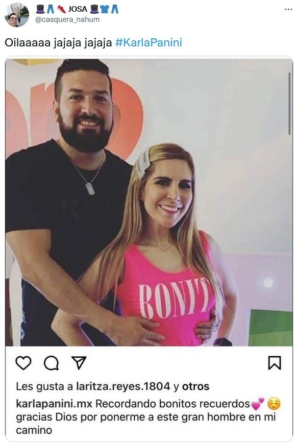 Karla Panini es un personaje que siempre traerá polémica sin importar el tiempo que pase sin hacerse presente en medios de comunicación o redes sociales, y esta ocasión no fue la excepción luego de su reaparición con un mensaje que sacudió a los cibernautas. Recientemente, Karla Panini compartió una fotografía con su esposo Américo Garza en su cuenta de Instagram donde aparecen juntos, pero la imagen no fue la responsable del nuevo escándalo, sino el mensaje que la compaña. La exintegrante de "Las Lavanderas" escribió:"Recordando bonitos recuerdos gracias Dios por ponerme a este gran hombre en mi camino".A partir de su publicación, que ya fue eliminada de su cuenta, Karla Panini fue blanco de señalamientos y críticas, otra vez, por lo que muchos acusan de una traición hacia su examiga y excompañera de trabajo al casarse con el esposo de Karla Luna.Varios usuarios coincidieron que Américo Garza no apareció en el camino de Karla Panini por intervención divina, sino que fue gracias a brujería, traición y manipulación de su hoy esposa, reavivando los ataques de 2017 cuando Karla Luna falleció, tras una pelea que perdió frente al cáncer, y luego de revelar que fue víctima de la infidelidad de esposo con la que por entonces fuera su colega en la dupla cómica.Karla Panini ha rechazado todas las acusaciones en su contra, alegando que su relación con Américo Garza se dio cuando él ya estaba separado de Karla Luna, y niega categóricamente que ella sea la causante del divorcio anterior de su ahora esposo.OA
