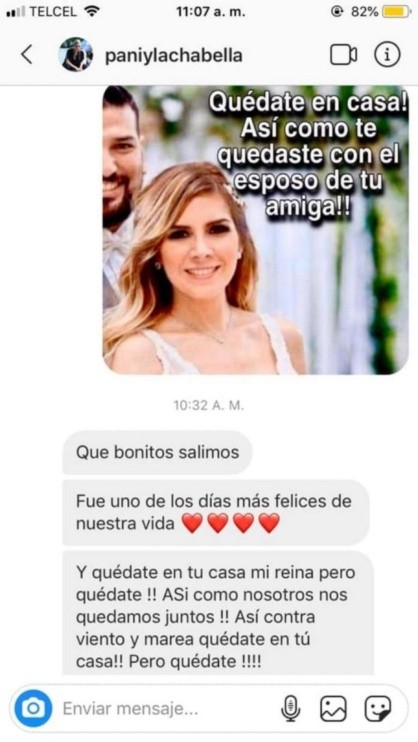 La conductora Karla Panini cerró su cuenta de Instagram luego de recibir un irónico meme a propósito del "quédate en casa" por la pandemia del coronavirus.Una cibernauta compartió una imagen en la que aparece Panini con su ahora esposo Américo Garza, y se lee: "Quédate en casa como te quedaste con el marido de tu amiga".Garza fue esposo de la fallecida Karla Luna, con quien Panini tenía una amistad y formó la exitosa dupla "Las lavanderas", los tres personajes estuvieron envueltos en una historia de traición que dio mucho de qué hablar, sobre todo en contra de Panini, quien en esta ocasión no soportó dicho meme y respondió a la cibernauta antes de cerrar su cuenta:"Qué bonitos salimos. Fue uno de los días más felices de nuesta vida. Y quédate en tu casa mi reina, pero quédate!! Así como nosotros nos quedamos juntos!! Así contra viento y marea quédate en tu casa!! Pero quédate!!", se lee.Esto provocó que nuevamente en Twitter, a través de memes, se recordara el triángulo amoroso entre Karla Panini, Américo Garza y Karla Luna.GC