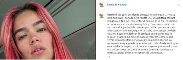 ¡“La Bichota” está triste! Karol G ha publicado este día en sus redes sociales la decepción que le causó la portada que publicó la revista GQ México, externando que no la representa y explicándole a sus seguidores que le pusieron muchos filtros deformándole la cara y el cuerpo.“No sé ni por dónde empezar este mensaje… Hoy se hizo pública mi portada de la revista GQ, una portada con una imagen que NO me representa. Mi cara no se ve así, mi cuerpo no se ve así y yo me siento muy feliz y cómoda con cómo me veo natural. Agradezco la revista oportunidad porque fui muy feliz cuando confirmaron que estaría ahí, pero a pesar de dejar clara mi inconformidad con la cantidad de ediciones que le hicieron a la foto, no hicieron nada al respecto, como si para verme bien necesitara de todos esos cambios”. También destacó que entiende las repercusiones que puede tener esto, “pero más allá de sentir que es una falta de respeto a mí, es a las mujeres que todos los días nos despertamos buscando sentirnos cómodas con nosotras mismas a pesar de los estereotipos de la sociedad”.Sus fans se han ido contra la revista reclamándole en redes sociales por la publicación, también otras celebridades se han solidarizado con Karol G, como Kany García y Justin Quiles.MF