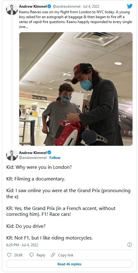 Keanu Reeves, quien fue protagonista en la película "Constantine" y "Matrix", tuvo un encuentro con un joven seguidor que lo vio luego de que el actor llegara de un vuelo en Nueva York; el momento se viralizó en redes y mostró de nuevo la humildad y sencillez que caracteriza al popular actor.Se cuenta que Reeves suele mostrarse sencillo con sus fanáticos, y en esta ocasión no fue la excepción. Afortunadamente para el joven, un productor de televisión llamado Andrew Kimmel tomó fotografías del momento mientras escuchaba la conversación del actor. Posteriormente compartió los hechos en su página de Twitter.El productor aseguró en su red social que una vez que ambos hicieron contacto, el fanático comenzó a hacerle una serie de preguntas que Keanu respondió amablemente."Keanu Reeves estaba en mi vuelo de Londres a Nueva York hoy. Un niño pidió un autógrafo en el equipaje y luego comenzó a disparar una serie de preguntas rápidas. Keanu felizmente respondió a cada una", escribió.Kimmel posteó cada una de las preguntas, entre ellas el joven cuestionó al actor por qué había estado en Londres, a lo que él respondió, "grabando un documental". Asimismo intercambiaron comentarios sobre la F1."Vi en línea que estabas en el Grand Prix, Keanu respondió: Sí, el Grand Prix (con acento francés, sin corregirlo). F1! ¡Autos de carreras!'"Reeves también le reveló que estaría en Nueva York durante cinco días para ver un espectáculo en Broadway y que vive en Los Ángeles.Una vez que el joven fanático agotó sus preguntas tocó el turno del actor, quien le preguntó cosas parecidas como a qué iba a Europa, cuál galería visitaría en París, y cuál era su favorita.El productor de televisión explicó que había publicado el suceso puesto que se trató de un acto de clase, "pequeños momentos como este pueden marcar una gran diferencia en la vida de las personas ¡Necesitamos más Keanus!". Además, añadió que el hombre fue muy amable pese a que regresaba de un vuelo internacional.Por supuesto, Kimmel no dudó en pedirle una fotografía a Reeves para el recuerdo, misma que publicó. Por otra parte, las imágenes del actor y el niño se hicieron tendencia en redes sociales.JM