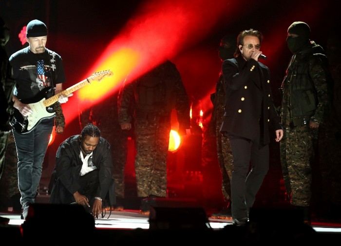 Kendrick Lamar inauguró la ceremonia de los premios Grammy con una poderosa y emotiva actuación que incluyó pantallas de video al fondo con una imagen de la bandera de Estados Unidos ondeando, mientras bailarines vestidos de soldados marchaban detrás de él.Fue acompañado por Bono y The Edge de U2, y por Dave Chappelle, quien hizo chistes en medio del número de Lamar el domingo en el Madison Square Garden de Nueva York. En un momento, bailarines vestidos de rojo fueron derribados mientras él rapeaba, volviendo después a la vida mientras ardían llamas de fuego en el número de seis minutos. Lamar interpretó seis temas de su disco "DAMN".Tras su número, James Corden, quien regresa como anfitrión por segundo año consecutivo, dio paso a Lady Gaga, quien cantó "Joanne" y "Million reasons".El primer premio de la noche fue para el propio Lamar, quien ya había obtenido tres galardones en la gala previa. Fue reconocido como Mejor interpretación de rap por "Loyalty".Lamar y Bruno Mars llegaron a la ceremonia ya con tres Grammy cada uno, perfilándose como favoritos en las categorías de álbum del año y grabación del año.Mars ganó los premios al mejor álbum de R&B, mejor interpretación de R&B y mejor canción de R&B en la llamada Premiere de los Grammy, donde se repartieron la mayoría de los galardones. Lamar se llevó los de mejor álbum de rap, mejor canción de rap y mejor video musical.También se repartieron varios premios póstumos, a la actriz Carrie Fisher, el cantante Leonard Cohen y el ingeniero Tom Coyne, quien trabajó en el álbum "24K Magic" de Mars.Los Rolling Stones obtuvieron el tercer Grammy de su Carrera, a mejor álbum de blues tradicional por "Blue & Lonesome", mientras que Ed Sheeran ganó mejor álbum pop vocal.Jay-Z fue el máximo nominado, en ocho categorías, aunque perdió en tres de ellas contra Kendrick Lamar, en la ceremonia previa.U2, Sting, Lady Gaga, Lorde y Kendrick Lamar son algunas de las celebridades que cantarán esta noche en la ceremonia.Algunas celebridades portaron rosas blancas en señal de apoyo a las víctimas de acoso sexual. JB.