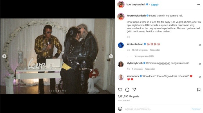 Después de un día de conjeturas sobre si se casaron o no, Kourtney Kardashian confirmó en Instagram que su boda con Travis Barker en Las Vegas fue sólo por diversión; es así que confirmó que no está legalmente casada con Travis Barker."Érase una vez en una tierra muy, muy lejana (Las Vegas) a las 2 am, después de una noche épica y un poco de tequila, una reina y su apuesto rey se aventuraron a la única capilla abierta con un Elvis y se casaron (sin licencia). La práctica hace al maestro", escribió Kardashian bajo las fotos de ambos en la capilla One Love Wedding.La pareja solicitó a un imitador de Elvis y el propietario de la capilla, Marty Frierson, declaró que consiguió uno luego que alguien reservó el concierto y pagó en línea. Frierson dijo que fungió como "testigo" cuando el pequeño grupo llegó después de los Grammy el domingo con personal de seguridad y su propio fotógrafo.La noticia de la boda se difundió rápidamente el martes, pero no se pudo encontrar una licencia de matrimonio.Kardashian y los representantes del baterista de Blink-182 no respondieron correos electrónicos ese día en busca de aclaraciones, y la pareja no dijo nada hasta la publicación en Instagram de Kardashian.Frierson fue cauteloso el martes cuando se enfrentó al enjambre de periodistas. "Vinieron y se casaron y pagaron por ello", dijo sobre la ceremonia en su pequeño negocio en una antigua casa de Las Vegas, a pocas cuadras de la Oficina de Licencias de Matrimonio del Condado de Clark. Dijo que la ceremonia costó unos 600 dólares y duró cerca de 30 minutos."No te voy a mostrar el papeleo", dijo Frierson. "Llegaron con un sobre blanco. Ellos pagaron".Nunca vio una licencia de matrimonio. Un portavoz del condado, Dan Kulin, dijo que Kardashian y Barker no obtuvieron una licencia en Las Vegas, pero que podrían haberse casado usando documentos obtenidos en cualquier condado de Nevada.Ambos solicitaron a un Elvis como oficiante, dijo Frierson. Llegaron en una limusina con otras cuatro personas. Dijo que a él y los miembros del personal se les prohibió grabar o tomar fotos. El imitador de Elvis cantó tres canciones, pero Frierson dijo que no podía recordar cuáles. Le dio a Kardashian un pequeño ramo de rosas rojas que ella arrojó para las fotos después en una entrada para autos.Los fanáticos de Kourt y Trav no deben preocuparse. Se planea un gran alboroto para las celebraciones de bodas más adelante, según TMZ.JM